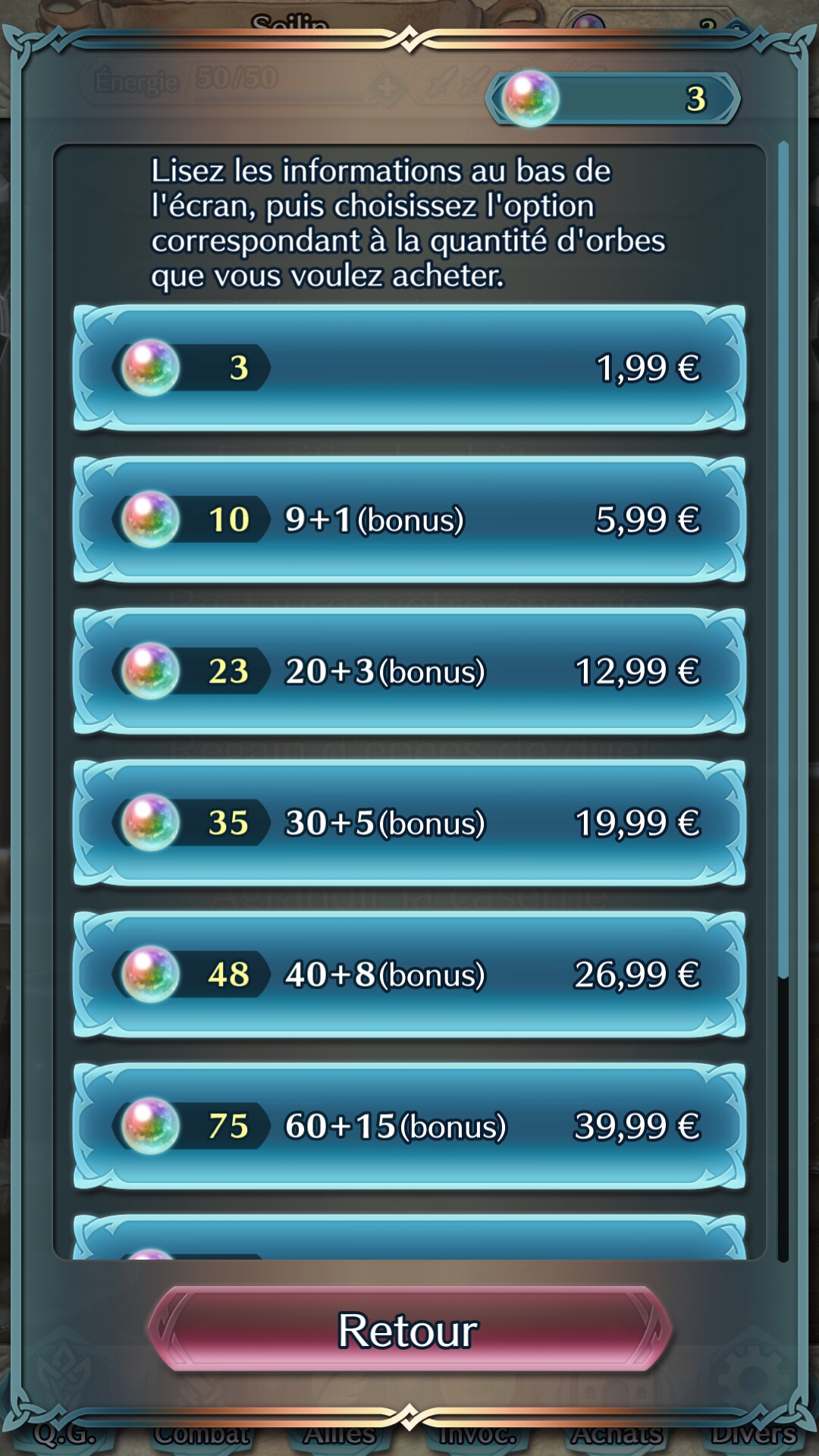 Pour autant, impossible d’acheter de quoi continuer à ce stade. Ce sont des objets obtenus par ailleurs qui permettent de les restaurer. Actuellement dans ma partie, les seuls achats possibles (moyennant finance) sont les orbes. Elles sont utiles pour invoquer les héros, et je pense que c’est là la plus grande tentation. Mais elles peuvent également être utilisées pour améliorer le château, ou encore agrandir la caserne (nombre de héros à accueillir).