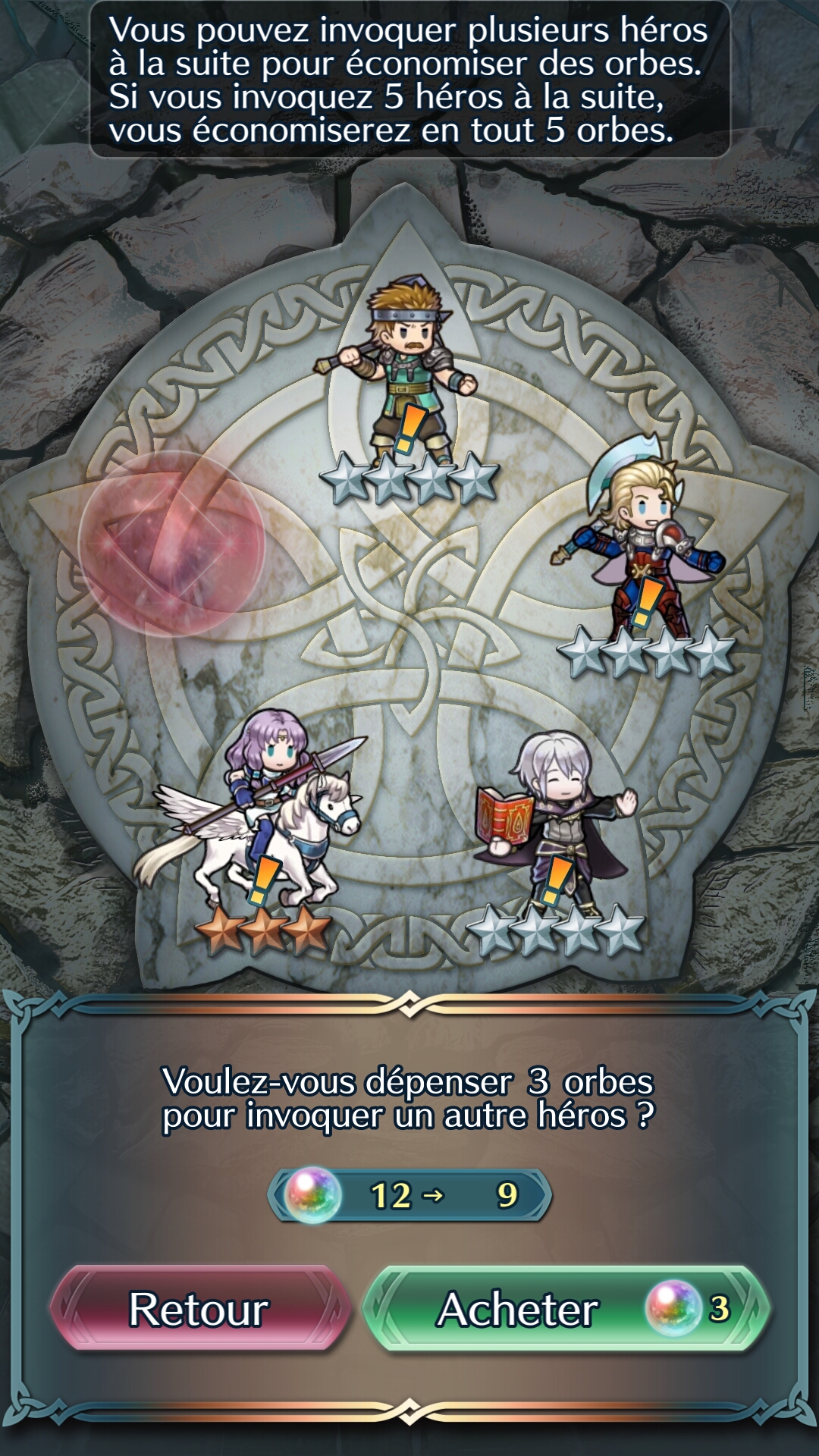 Le système d’invocation est assez aléatoire. Plusieurs thèmes sont disponibles (actuellement « Héros légendaires » ou « Sentiments Profonds »), avec pour chacun d’eux une sélection de héros de niveaux différents, représentés par un certain nombre d’étoiles, allant jusqu’à 5 pour les plus rares. Une fois le thème sélectionné, 5 orbes sont nécessaires pour accéder à la chambre d’invocation où se trouvent 5 gemmes de couleur. Ces couleurs correspondent à celle du personnage, et donc de son arme. Par exemple pour obtenir Camilla il faut en sélectionner une verte, pour Lucina une rouge… Ensuite c’est au petit bonheur la chance, et il ne reste plus qu’à espérer pour obtenir les personnages voulus et de bon niveau. Chaque héros invoqué coûtera des orbes, mais si on invoque les 5 à la suite, le tarif est dégressif, et il faudra compter un total de 20 orbes.