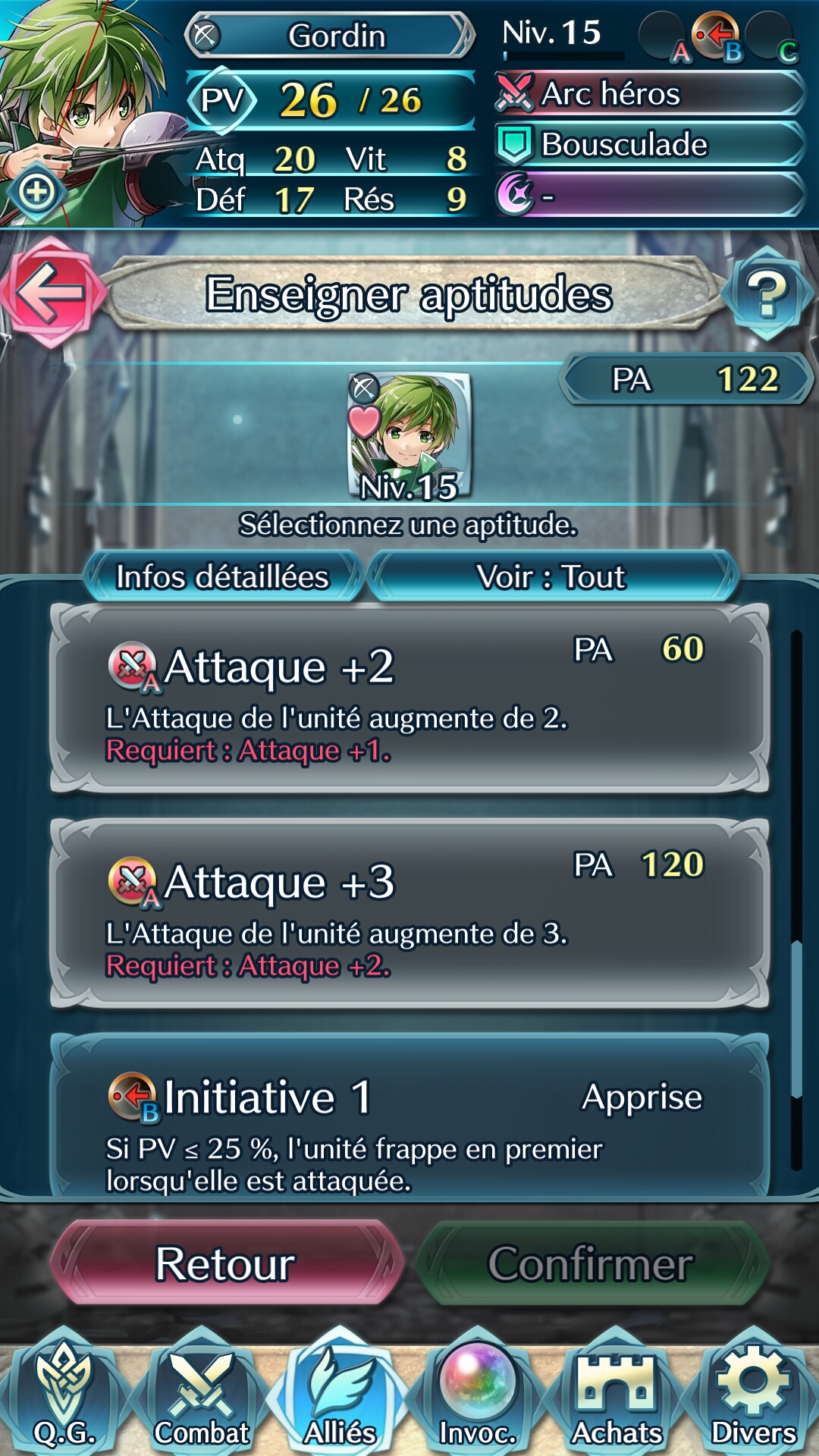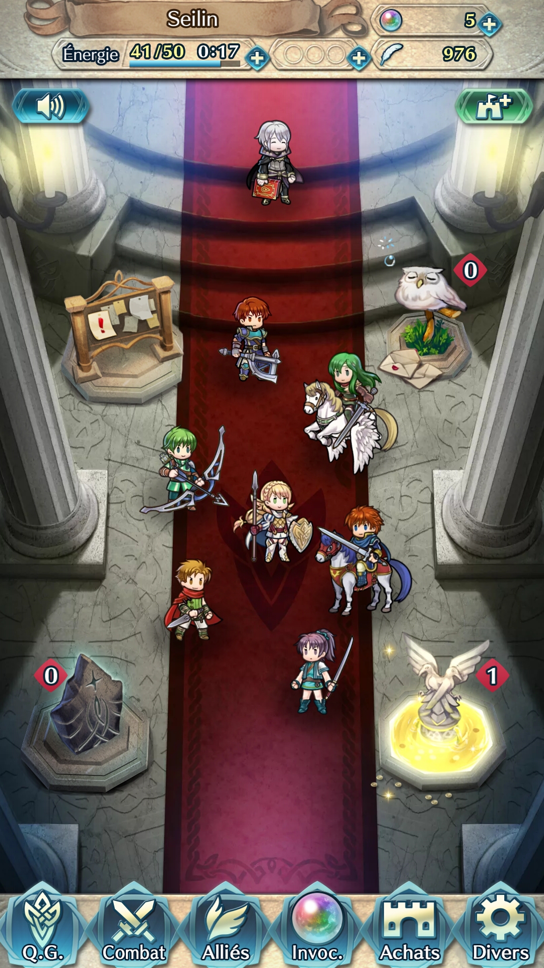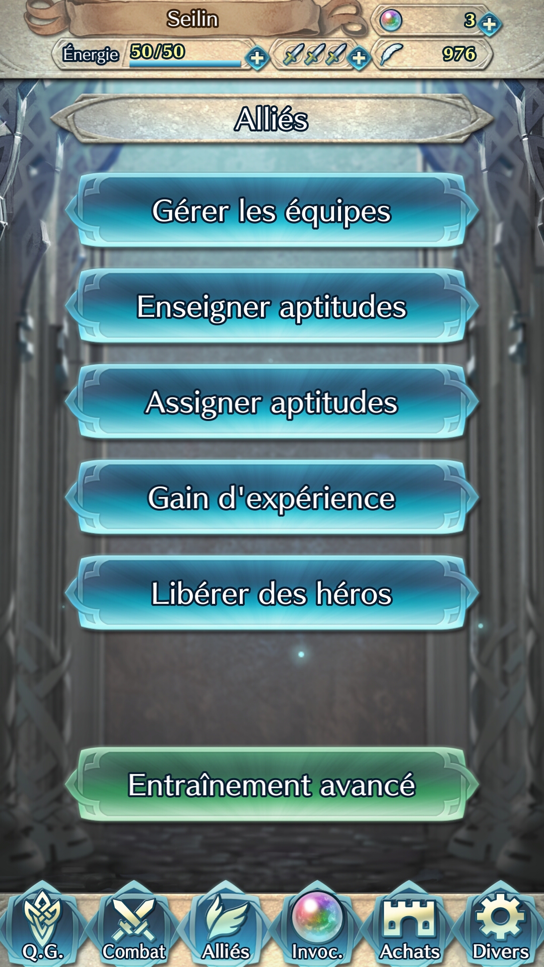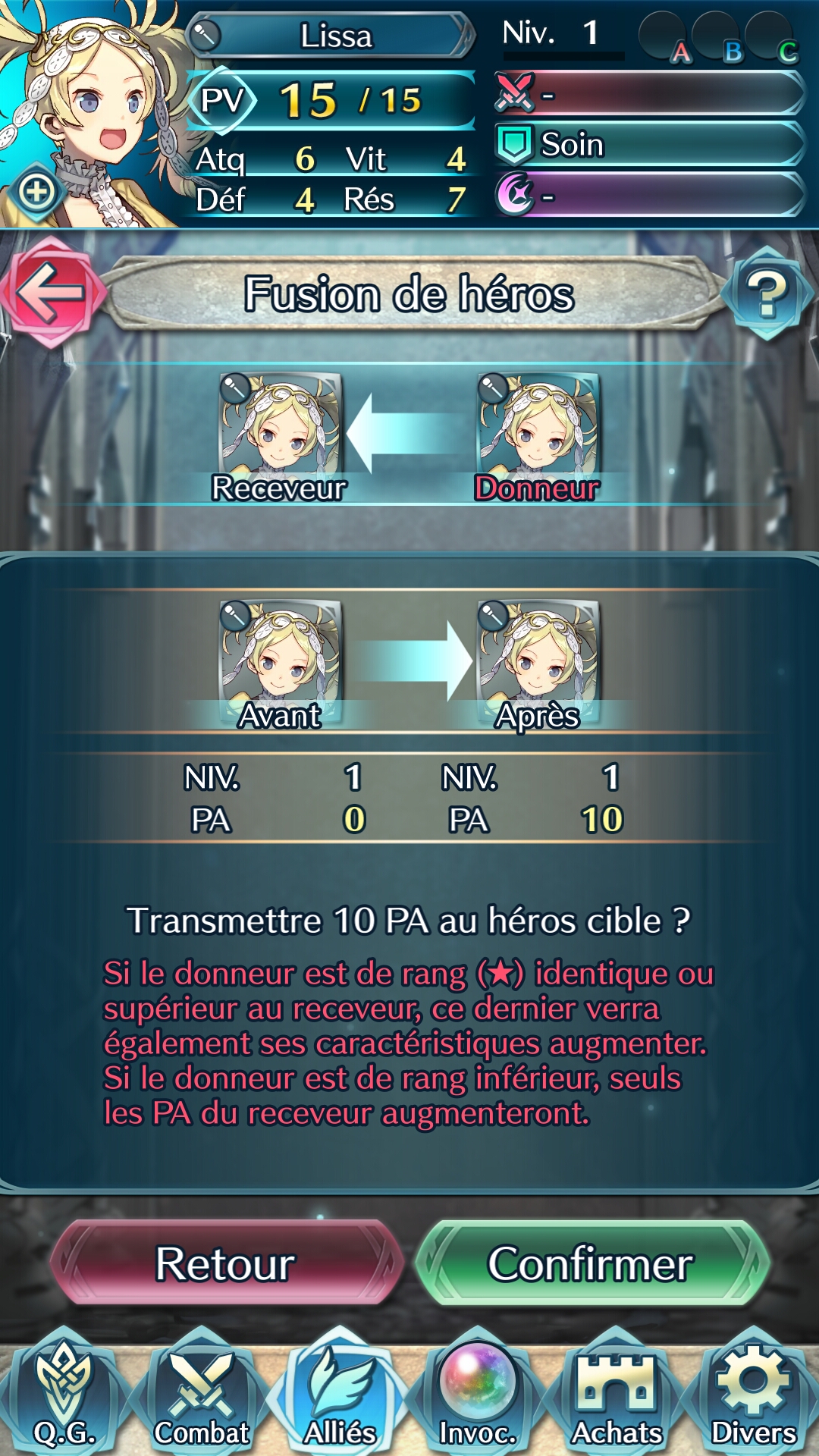 Une grande partie du jeu est consacrée à la gestion de son équipe. Car plus il y aura de héros invoqués, plus les possibilités seront nombreuses. Il faut les entraîner, les combiner pour disposer d’équipes polyvalentes en fonction des futurs combats, prendre le temps de vérifier les aptitudes de chacun et d’en assigner des nouvelles après des montées de niveaux… Tout ceci se gère dans la partie alliés, avec l’affichage de tous nos héros, et même la possibilité d’en fusionner ou même de leur donner un niveau (une étoile) en plus, mais moyennant un grand nombre de plumes de héros…