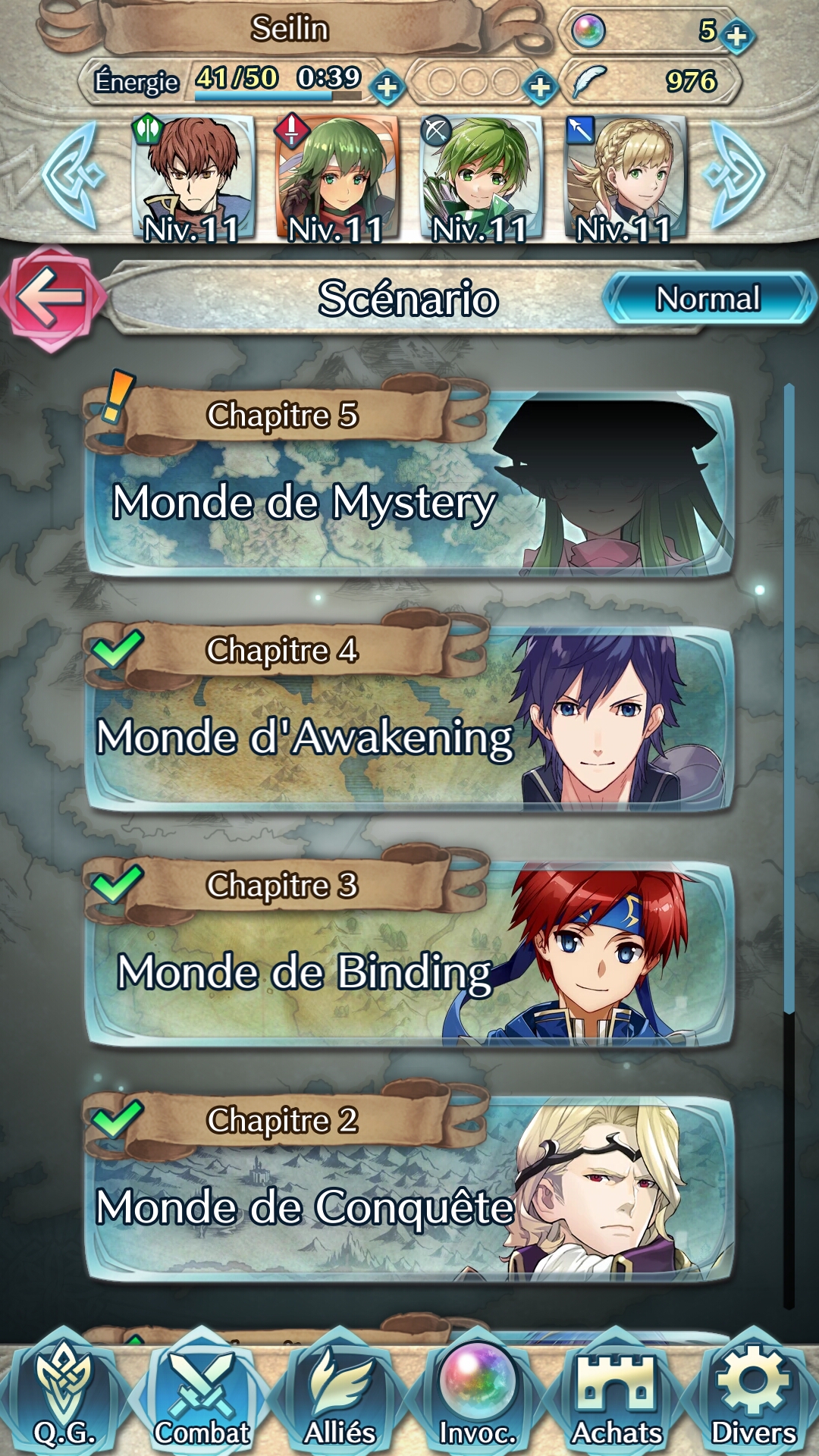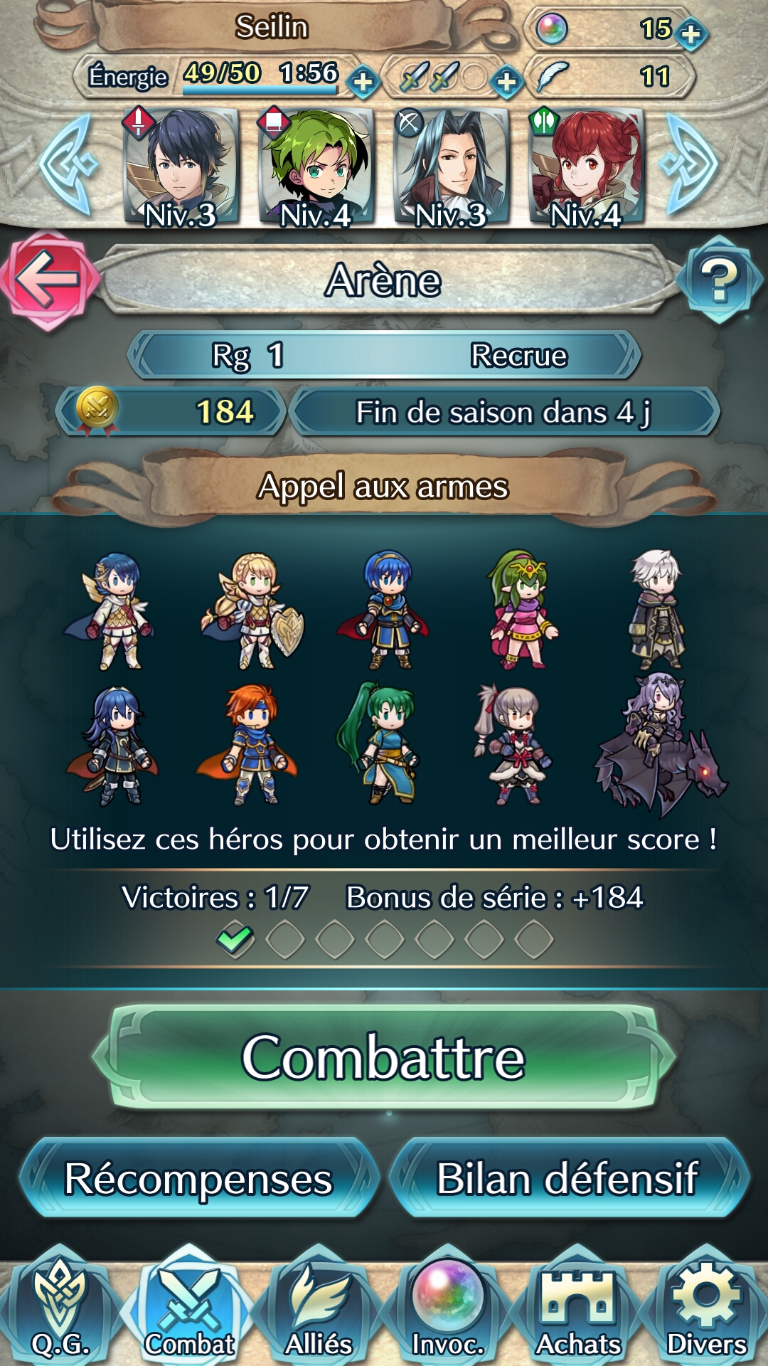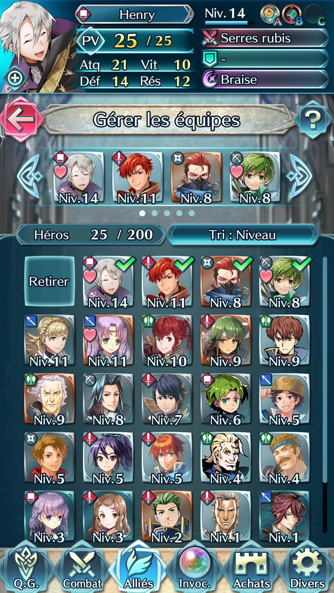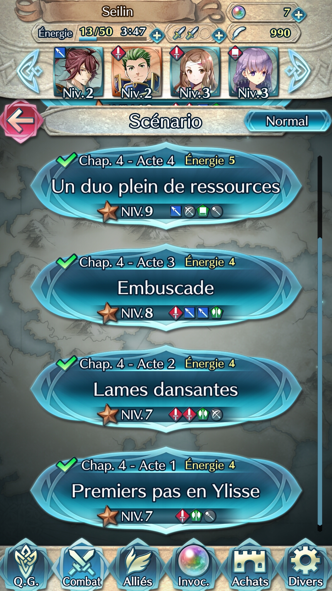 Une grande partie du jeu est consacrée à la gestion de son équipe. Car plus il y aura de héros invoqués, plus les possibilités seront nombreuses. Il faut les entraîner, les combiner pour disposer d’équipes polyvalentes en fonction des futurs combats, prendre le temps de vérifier les aptitudes de chacun et d’en assigner des nouvelles après des montées de niveaux… Tout ceci se gère dans la partie alliés, avec l’affichage de tous nos héros, et même la possibilité d’en fusionner ou même de leur donner un niveau (une étoile) en plus, mais moyennant un grand nombre de plumes de héros…