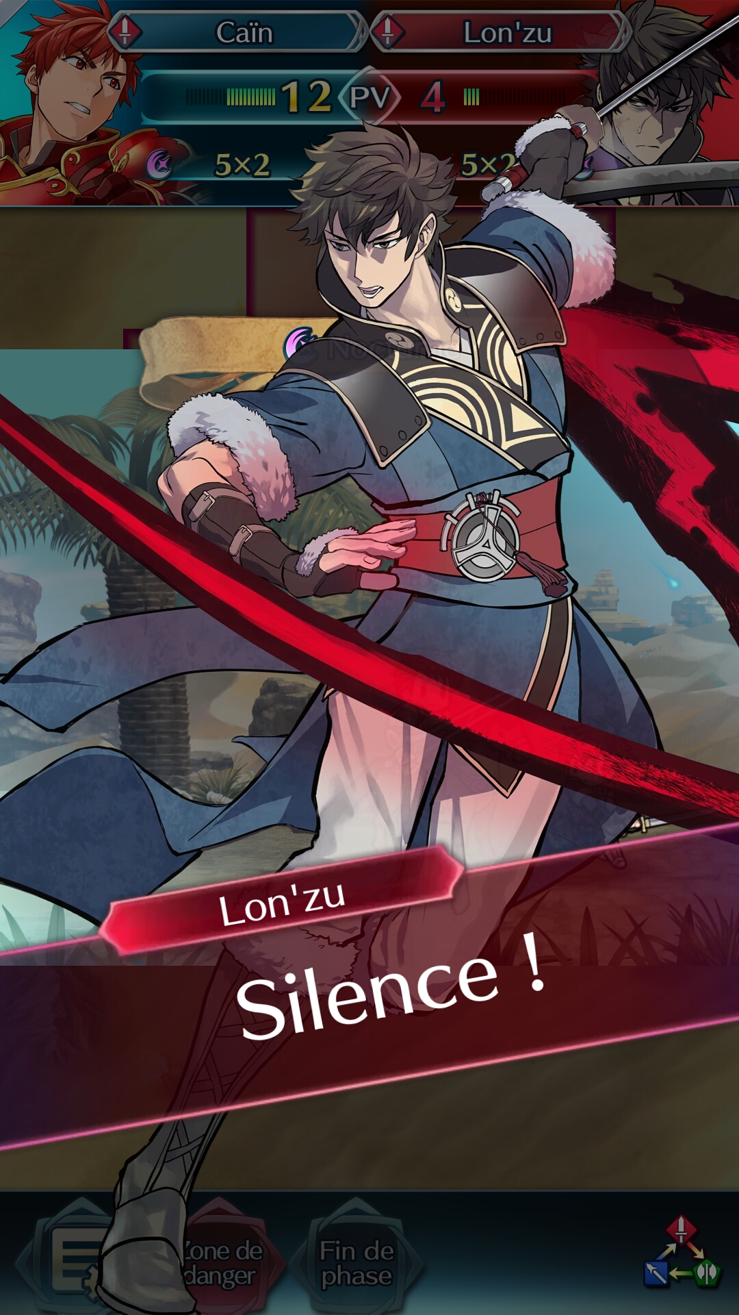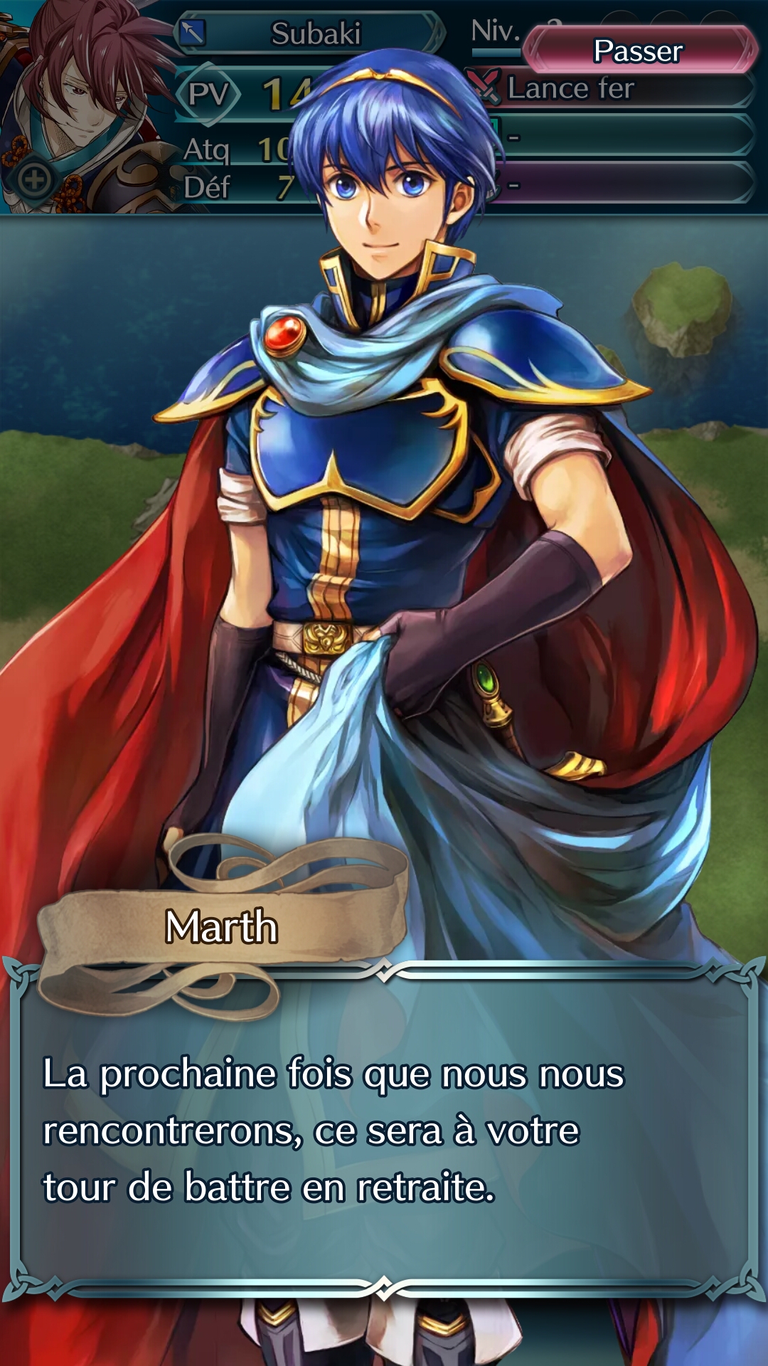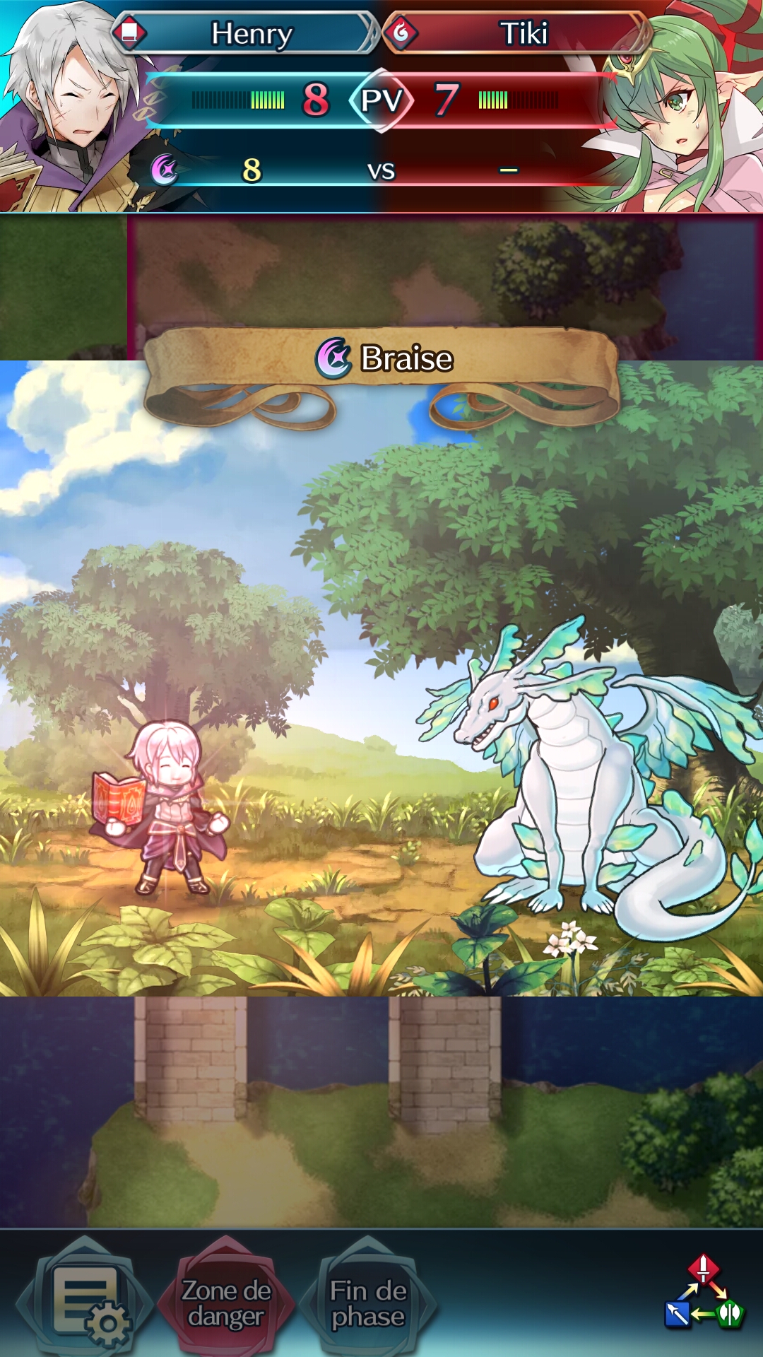 Une fois notre héros suffisamment à portée, une attaque peut être portée à l’ennemi, ou un soutien à un autre allié. Pour l’attaque, la case devient rouge avec deux épées qui se croisent au-dessus de l’ennemi, et pour le soutien, la case est verte avec un bouclier. Avant d’attaquer, la partie haute de l’écran montre le résultat final, très pratique pour voir les écarts de force et qui sortira vainqueur du combat. Ensuite, l’attaque consiste seulement en une cinématique, le joueur ne peut jouer sur rien une fois qu’elle est lancée. Certains héros disposent toutefois d’une attaque spéciale qui se déclenche après un certain nombre de tours, mais cela se fait automatiquement.