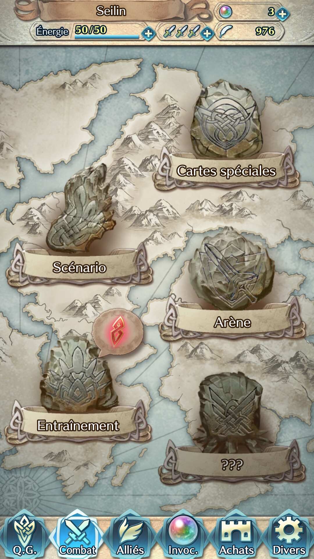 Il faudra toutefois un peu plus de temps pour l’aspect gestion du jeu, qui ne se résume pas qu’à quelques combats, loin de là! Différentes icônes permettent de naviguer entre toutes les possibilités, du QG avec la gestion des quêtes, missions, des amis et des cadeaux, aux invocations, en passant par la carte des combats ou la gestion des alliés. Le QG par exemple est un endroit clé, où le passage est quasi obligatoire à chaque session pour saluer le héros d’un ami, ou recevoir un cadeau (qui sont très régulier à la sortie du jeu). Seule l’icône « Achats » sera moins utilisée pour ceux qui ne désirent pas mettre la main au portefeuille, mais reste tout de même utile car elle intègre la possibilité d’améliorer son château contre quelques orbes.