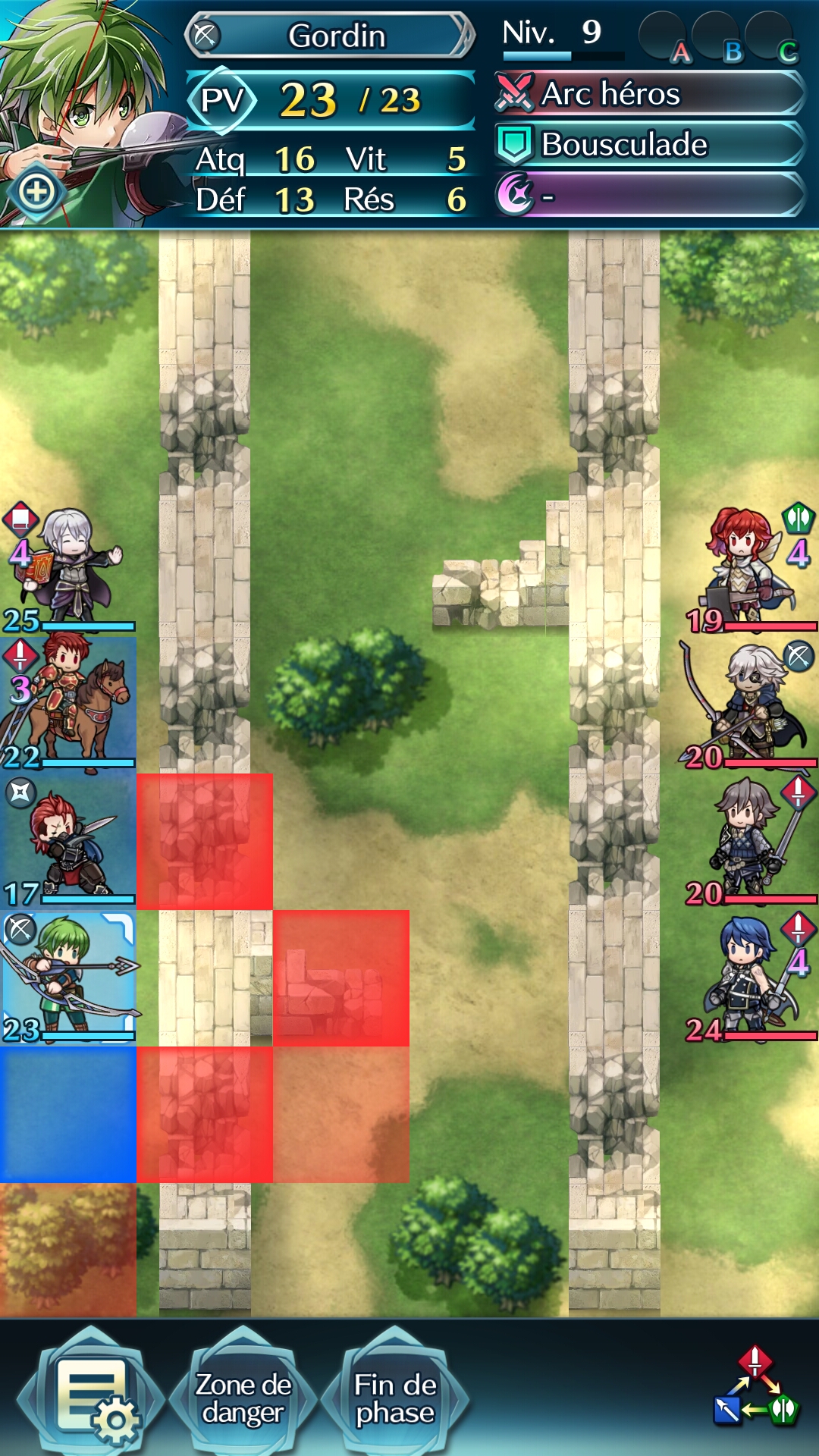 Une fois les combats lancés (quel que soit le mode), la carte est affichée, avec tous les personnages qui sont cliquables pour découvrir leurs caractéristiques. Il est possible d’afficher la zone de dangers, correspondant à la zone d’attaque limite de tous les ennemis. Sinon en touchant chacun d’entre eux, leur zone spécifique et la portée de leurs attaques s’affiche (1 ou 2 cases selon l’arme), de même pour nos alliés.