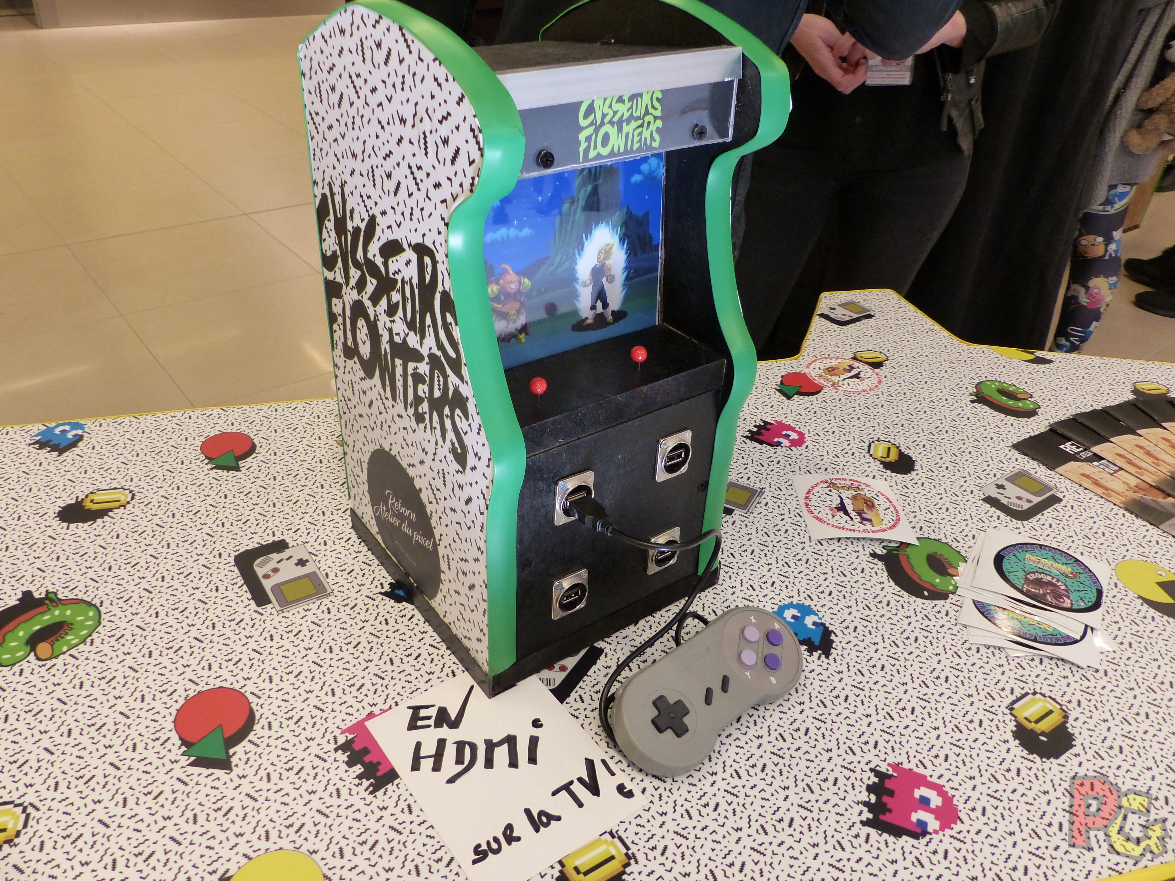 Ainsi, j’ai pu faire la connaissance de l’Atelier Reborn, créateurs de bornes d’arcade personnalisées, que ce soit en taille ou en design. Ils étaient présents pour montrer leurs oeuvres, qui étaient utilisables avec un grand nombre de jeux jouables. Ce fut assez étonnant de faire Super Mario Bros 2 sur arcade! Ils ont également montré leur travail par un montage en direct d’une mini-borne toute la matinée, mais comme je suis restée dans la salle de conférence, je n’ai pas pu voir ça, et je l’ai bien regretté! J’espère pouvoir revenir sur le travail de cette équipe plus tard suite à un très bon contact avec eux.