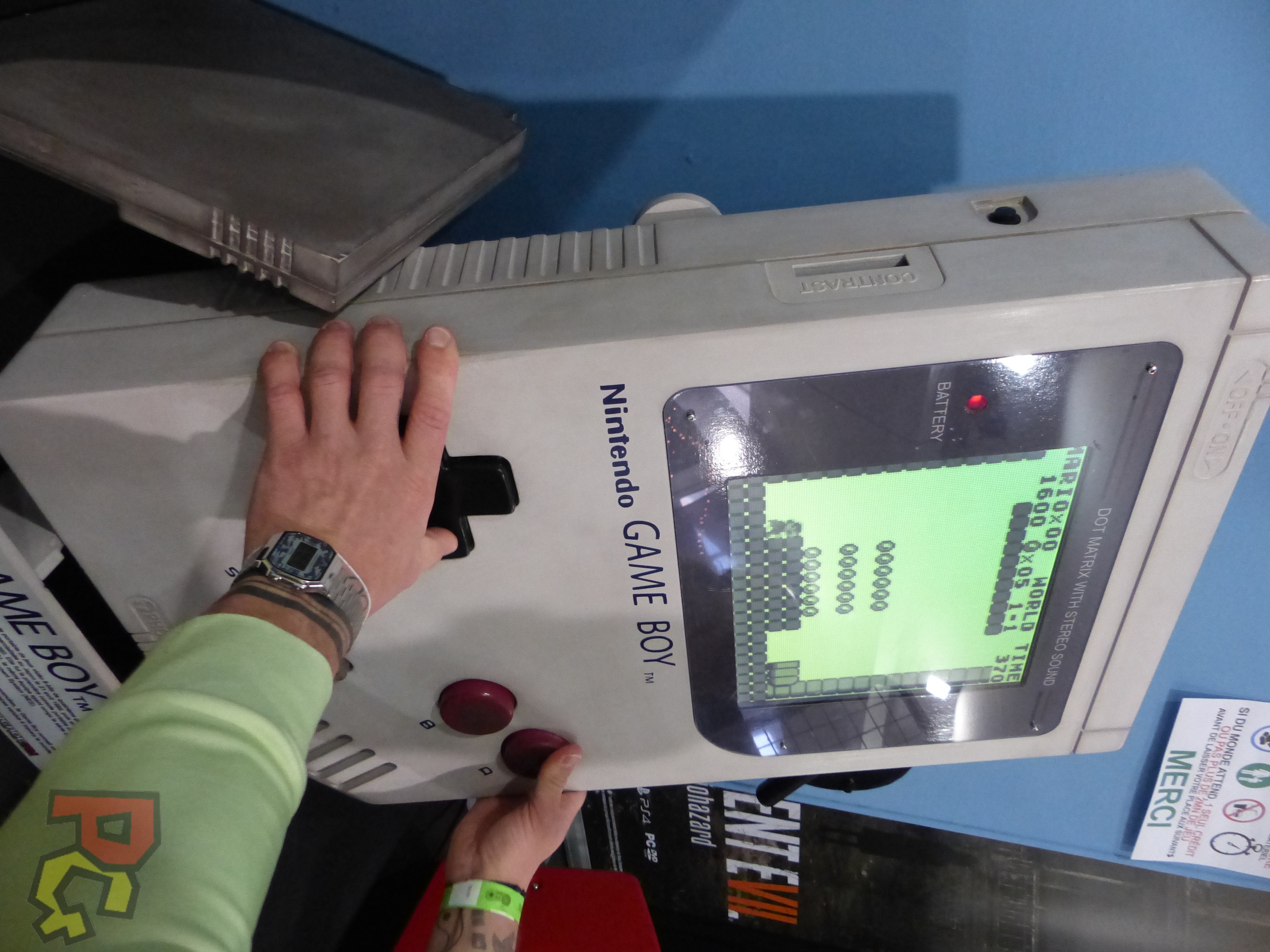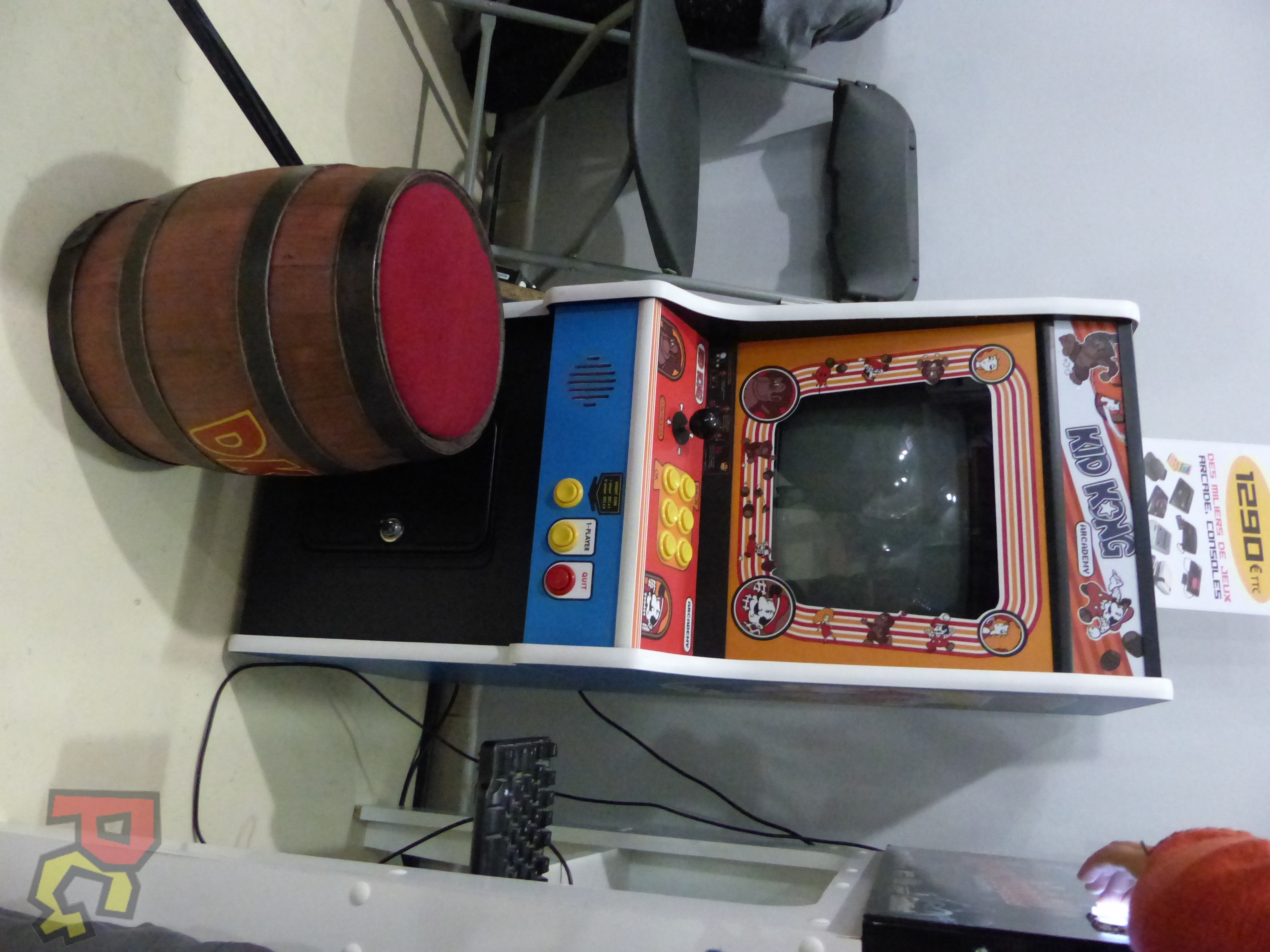 Un peu plus loin, c’était une console géante qui attirait l’attention. Une Gameboy plus précisément, où il était possible de jouer à Mario Bros, Tetris ou encore Pokémon. Mais pour l’avoir essayé plus d’une fois, elle n’est pas très pratique (et beaucoup moins portable…). Sur le même stand, des bornes d’arcade de toutes tailles, jouables et en vente. Et ce tabouret Donkey Kong… Je veux le même à la maison !