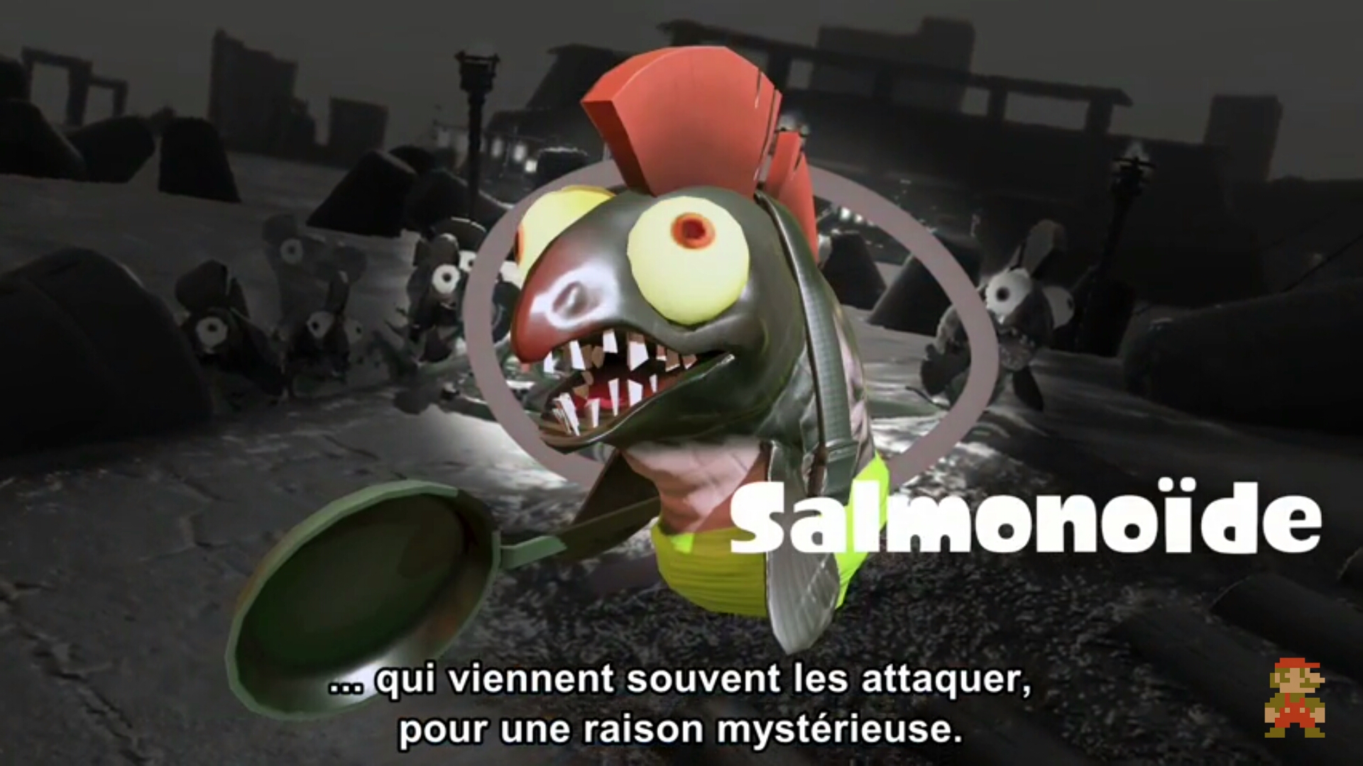 Enfin, on termine avec une autre longue présentation, qui commence toutefois de manière très étrange. Une mini-vidéo de recrutement, assez vieillotte et mal faite… Tout ceci pour nous présenter un nouveau mode de jeu, la Salmon Run, où il faut partir à la chasse aux œufs de saumon. Présenté comme un « job à temps partiel« , cette chasse se révèle plutôt ardue, car il faut partir combattre une toute nouvelle espèce, les Salmonoïdes. Quatre joueurs se retrouveront sur une île très lointaine, avec un équipement spécial. Et si un des joueurs est attaqué par la peinture adverse, il pourra être réanimé grâce à sa bouée de sauvetage. Dangereux, mais les récompenses associées semblent être très intéressantes. Ce mode a de plus le mérite de renouveler le jeu, qui ne se satisfait pas d’un simple portage.