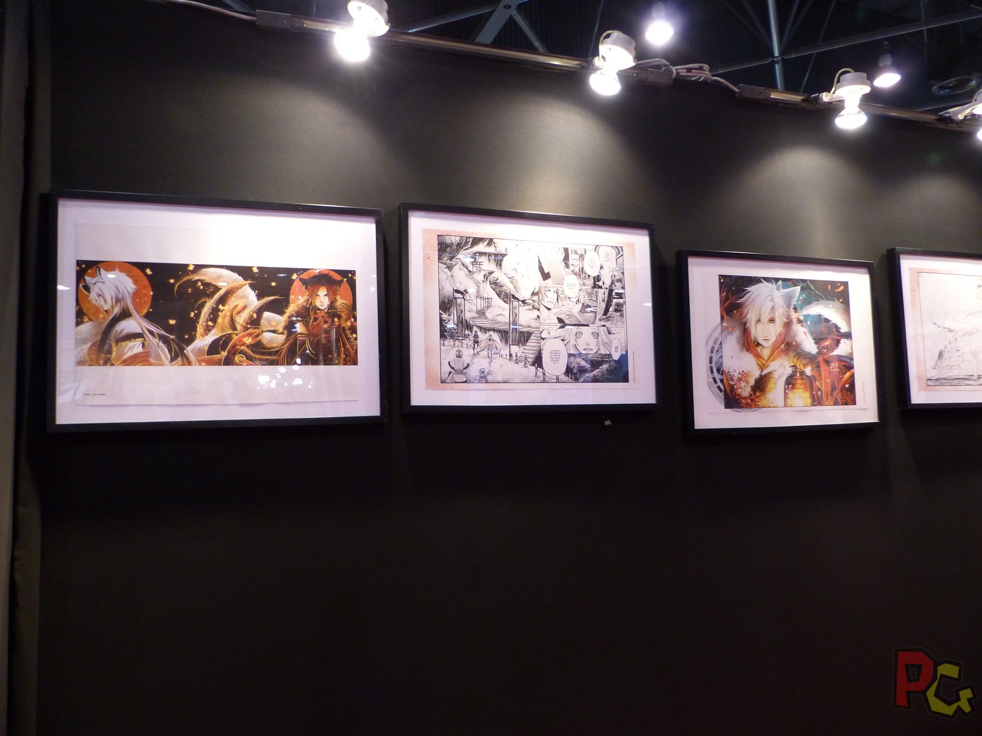 Si vous aimez les mangas et animés, Konoha sera parfait. Vous pouvez y retrouver de nombreux stands de goodies et d’objets de culture japonaise, des créateurs, ou des animations comme du dessin ou de la calligraphie. Et cette année, pour la première fois, un stand Glénat trônait au milieu de cet univers. Présent pour promouvoir la mangaka Van Rah (que je ne connaissais pas du tout), le stand était constitué d’une boutique cloisonnée, grande, très sobre (du moins au début du salon quand il n’y avait personne) et surtout très fournie en mangas, comics et figurines. Et juste à côté, de l’autre côté de l’allée, une grande exposition sur plusieurs oeuvres de la mangaka.