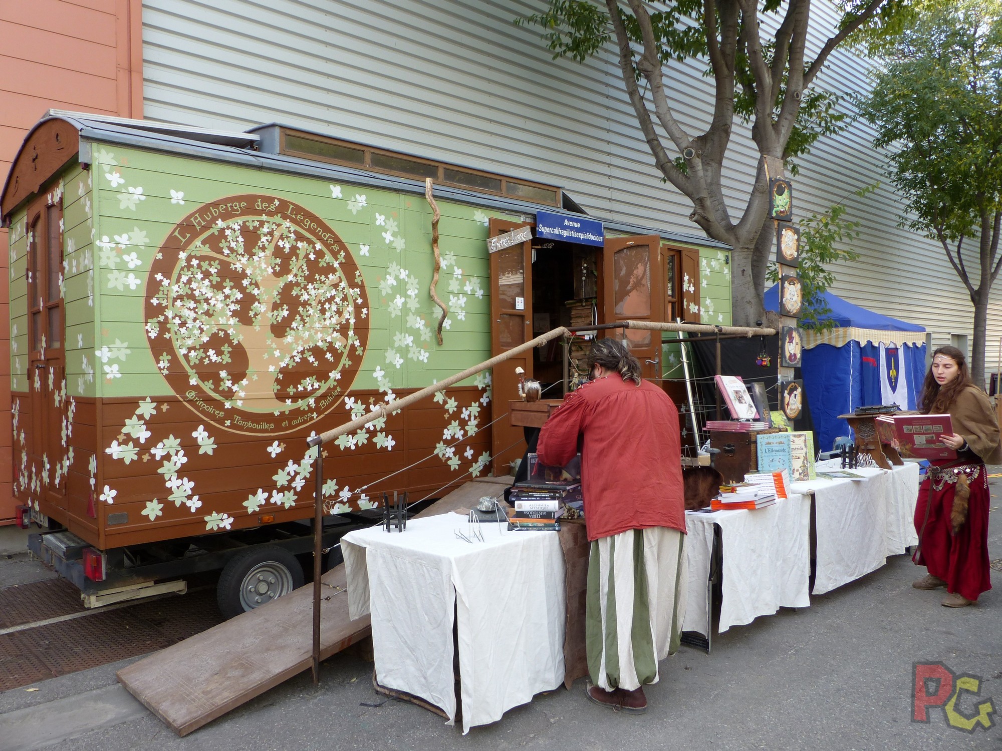 Tout d’abord l’espace médiéval, un habitué du salon. Les stands sont ici construits à l’image d’autrefois, avec des tentes, du tissu et du bois. Et on y trouve des choses étonnantes. Des armes anciennes à une roulotte librairie, en passant par une ferme ou même des loups, tout y est !