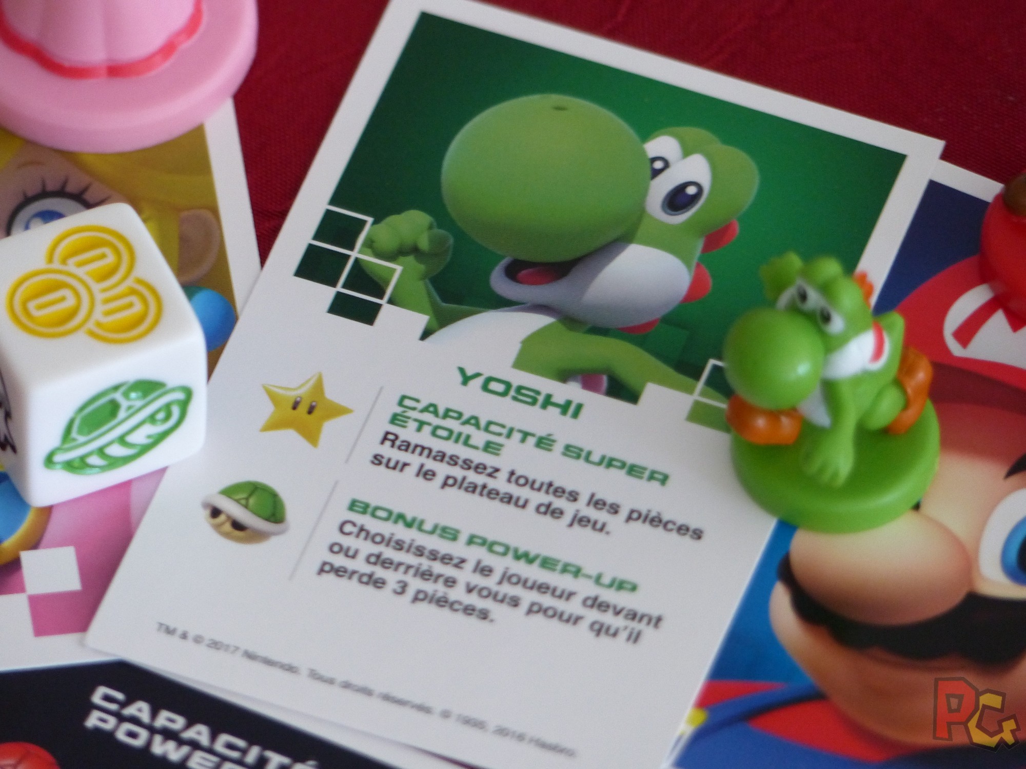 - 2 dés à 6 faces, un classique et un avec des icônes bien connues des jeux Mario (carapace, POW, pièces…)
