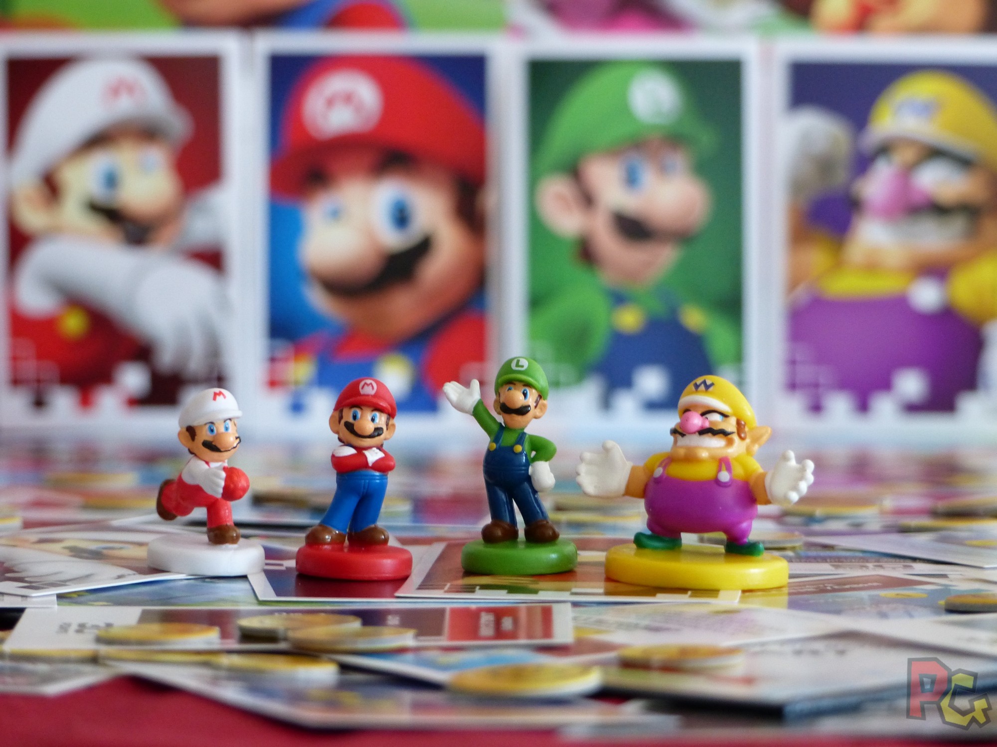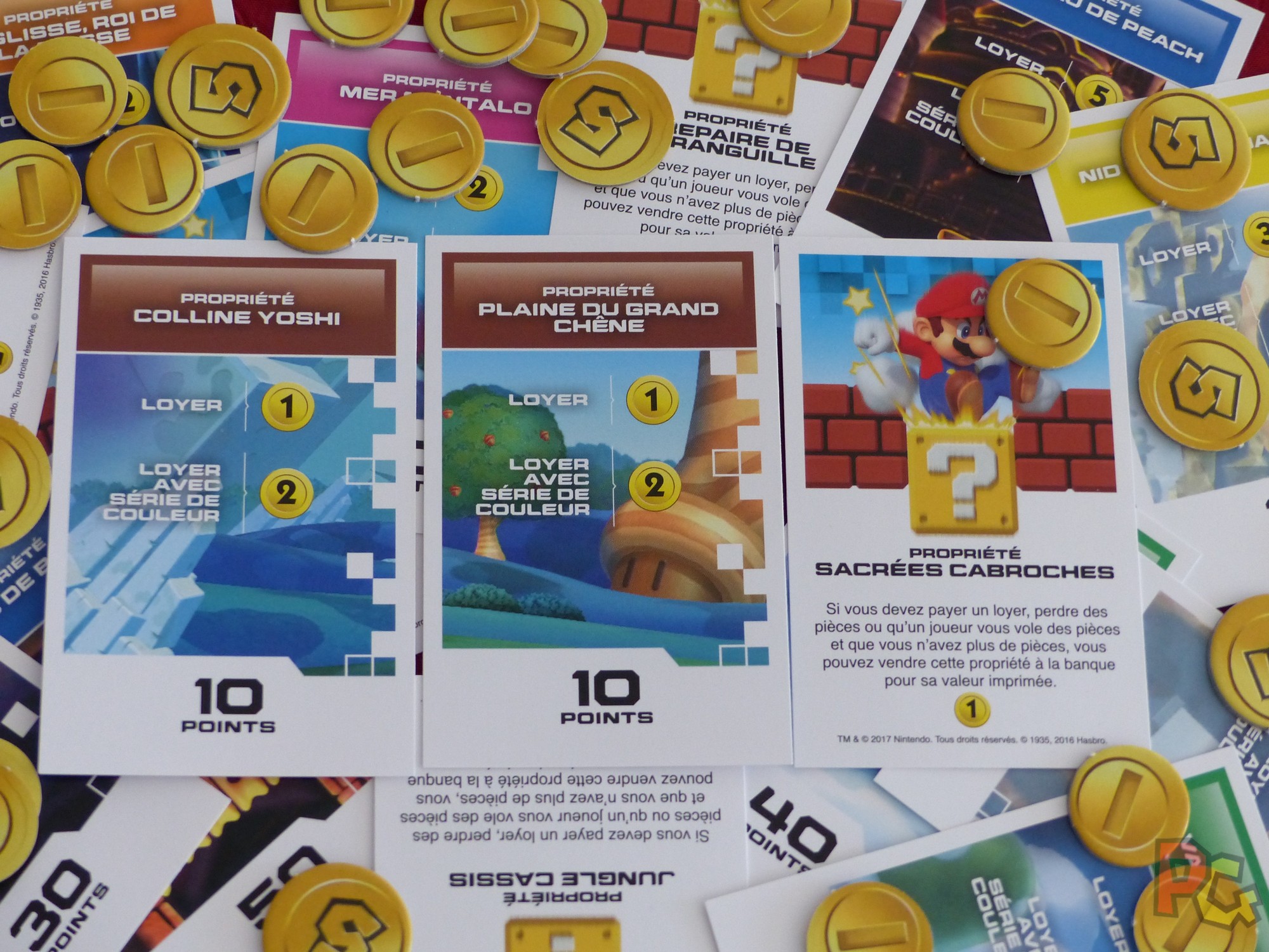 Le jeu est fait pour s’amuser avant tout. Il n’y a pas de taxes, de salaire et de paiement concret comme le Monopoly classique. Ici on gagne des pièces comme si on parcourait un niveau d’un jeu Mario. On en perd de la même façon, en se faisant toucher par une carapace ou par un Thwomp. Ce qui rapproche un peu plus du jeu vidéo, c’est quand le personnage récupère toutes les pièces qui sont tombées sur les cases qu’il traverse. J’imaginais même la petite musique qui allait bien avec et les bruitages des pièces. Le dé power-up m’a beaucoup fait penser aux objets de Mario Kart, de même que les capacités de chaque personnage. Je dois toutefois reconnaître qu’une fois encore, Mario est fortement avantagé par rapport aux autres, car il accumule un nombre impressionnant de pièces tout au long de la partie, permettant ainsi d’acheter un maximum de propriétés.