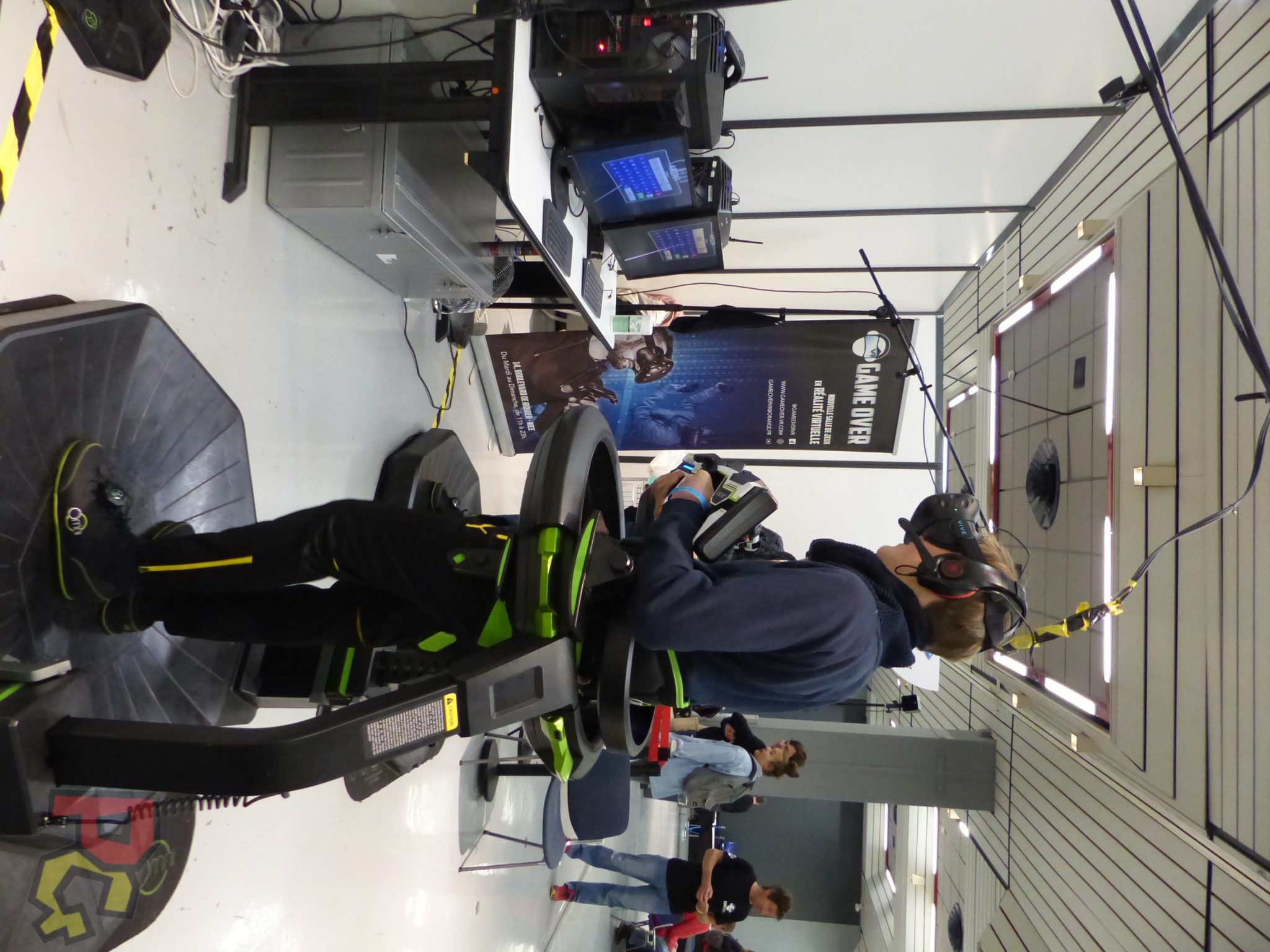 Pour la partie jeux vidéo, il y avait du classique, avec des bornes d’arcade et des consoles rétro (avec la présence du Re-Play Festival), mais aussi de la VR, dans des configurations simples ou beaucoup plus complexe. Car si le stand Gamergen proposait plusieurs jeux de PSVR, un autre était là pour présenter son concept de salle d’arcade dédiée aux jeux en réalité virtuelle qui a ouvert à Nice, et surtout un système de jeu en VR qui englobe le corps entier. Chaque joueur devait mettre des chaussures spéciales (sur roulettes ?) permettant d’avoir l’impression d’avancer en faisant du sur place sur une plateforme incurvée, être harnaché au niveau de la taille à l’intérieur d’une station de maintien pour ne pas tomber, et bien sûr porter le casque pour jouer au jeu en VR. Je n’ai pas eu l’occasion de m’y essayer, le stand étant pris d’assaut dès l’ouverture, mais j’ai trouvé le concept super intéressant !
