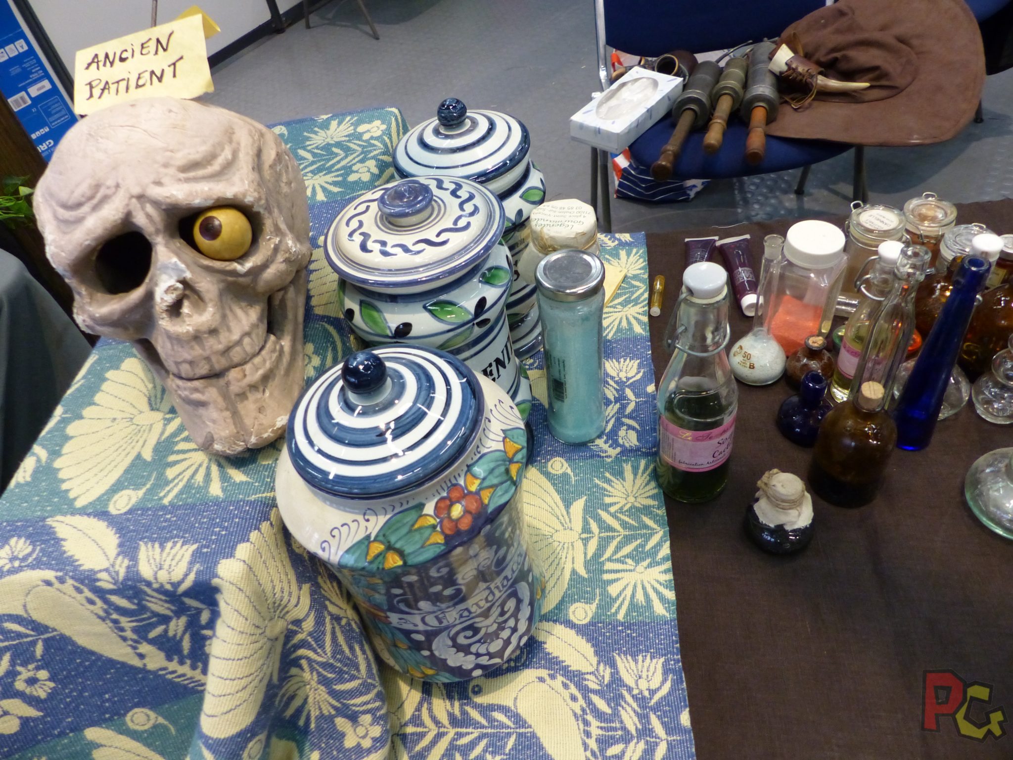 Et au rez-de-chaussée, ce fut une toute autre expérience que nous avons vécue. Peut-être moins importante, mais tout à fait loufoque, et qui mérite d’être racontée. C’était à un stand qui m’avait interpellée en passant devant, juste avant les escaliers. Un charlatan professionnel, avec des énigmes, des casse-têtes, mais aussi de la divination et des massages (sans oublier du thé à la menthe). Plusieurs fois dans la journée, ce charlatan faisait quelques tours de passe-passe, montrant à tout le monde qu’il gagnait à tous les coups aux divers jeux qu’il proposait (cartes, jetons…). Et petit à petit, en voulant s’y essayer encore et encore, nous avons pu apprendre quelques tours. C’est à la fois très simple et complexe. Simple dans la théorie, mais complexe dans la pratique, car il faut avoir une sacrée dextérité pour tromper le public sur certains points. C’était assez déroutant, mais j’ai beaucoup aimé !