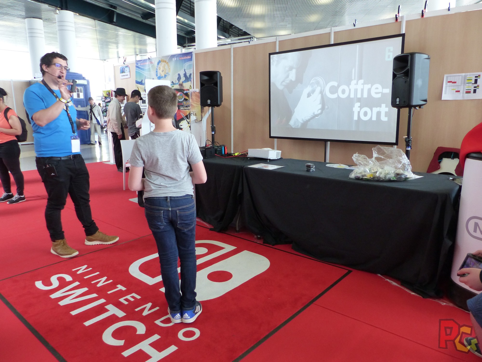 Les jeux vidéo ont connu pas mal de succès, et je n’ai pas pu tout essayer tellement il y avait de monde, surtout sur le stand de Upside, avec un appareillage de jeu en réalité virtuelle en immersion totale (comme j’avais déjà pu voir au Play Azur Festival, sans pouvoir essayer non plus). Chose assez étonnante, le seul constructeur qui avait son propre stand était Nintendo, via l’association Nintendo Sunshine. Un stand grand, clair, et très enjoué comme souvent (en toute objectivité).
