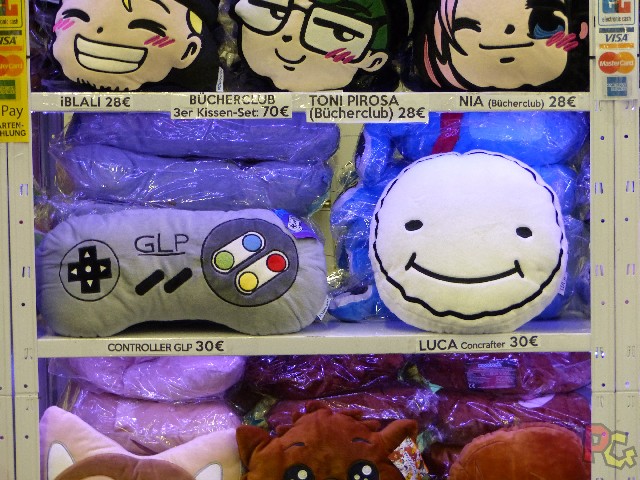 Enfin, comme dans tout événement similaire, même si ici ce n’est pas la majorité, les boutiques faisaient le bonheur des acheteurs. Car tous les stands mentionnés jusqu’à présent ne vendaient rien du tout. Tout au mieux ils délivraient quelques goodies aux joueurs. Et les espaces d’achat restent à l’échelle du reste, énormes. Mais dans des halls moins hauts, souvent divisés sur 2 étages. Beaucoup plus de produits officiels que partout ailleurs, des peluches par milliers, des vêtements en masse, et d’autres articles qui semblent presque indispensables quand on les voit, mais j’ai dû me limiter à cause de l’avion et du manque de place…