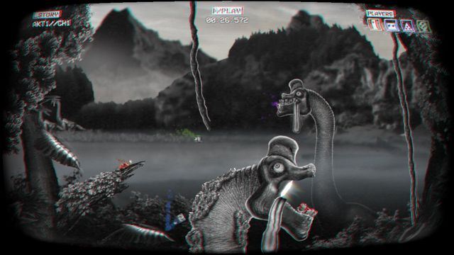 Epic Loon est un jeu qui ne se prend clairement pas la tête. On ne comprend pas toujours très bien ce qu’il se passe, c’est presque tout en noir et blanc avec des glitchs de vieux magnétoscope, les personnages sont vulgaires (mais drôle la plupart du temps), et aussi étonnant que cela puisse paraître, c’est génial ! Le concept m’avait plu dès le départ, et plus j’y ai joué, plus j’ai aimé le jeu. La nostalgie des vieux films de notre enfance (ou de celle de nos grands-parents), le côté totalement décalé, le gameplay atypique et une bande-son qui déchire, pour moi c’est un pari réussi. Je sais que cela n’a pas plu à tout le monde, même à la maison, mais il suffit d’une partie pour l’adopter (ou pas).