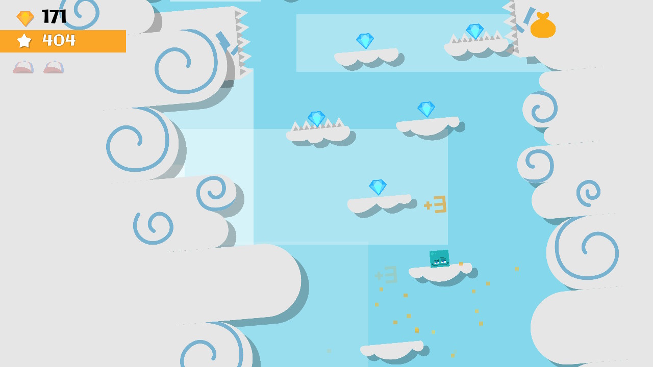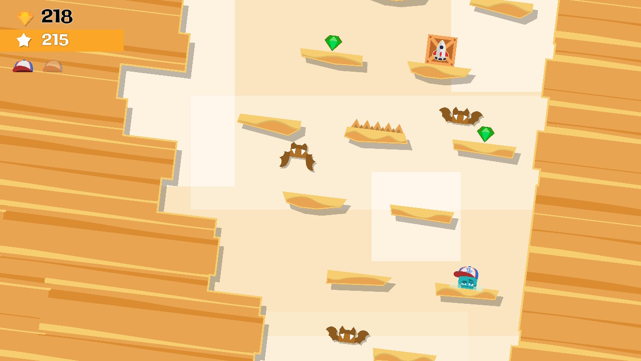 Toutes ses capacités correspondent également à différents objets disponibles ici et là sur les plateformes, sous forme de caisses. Boost, bombes, vies, ou encore aimants à diamant, chacun a son utilité. Et pour essayer d’aller le plus haut possible, il va falloir essayer de visualiser le plus tôt possible où se situent ces caisses, pour tenter de trouver un chemin pour y accéder. Si ce n’est pas possible, ce n’est pas dramatique pour autant, mais cela vous ralentira, où vous fera gagner moins de diamants.