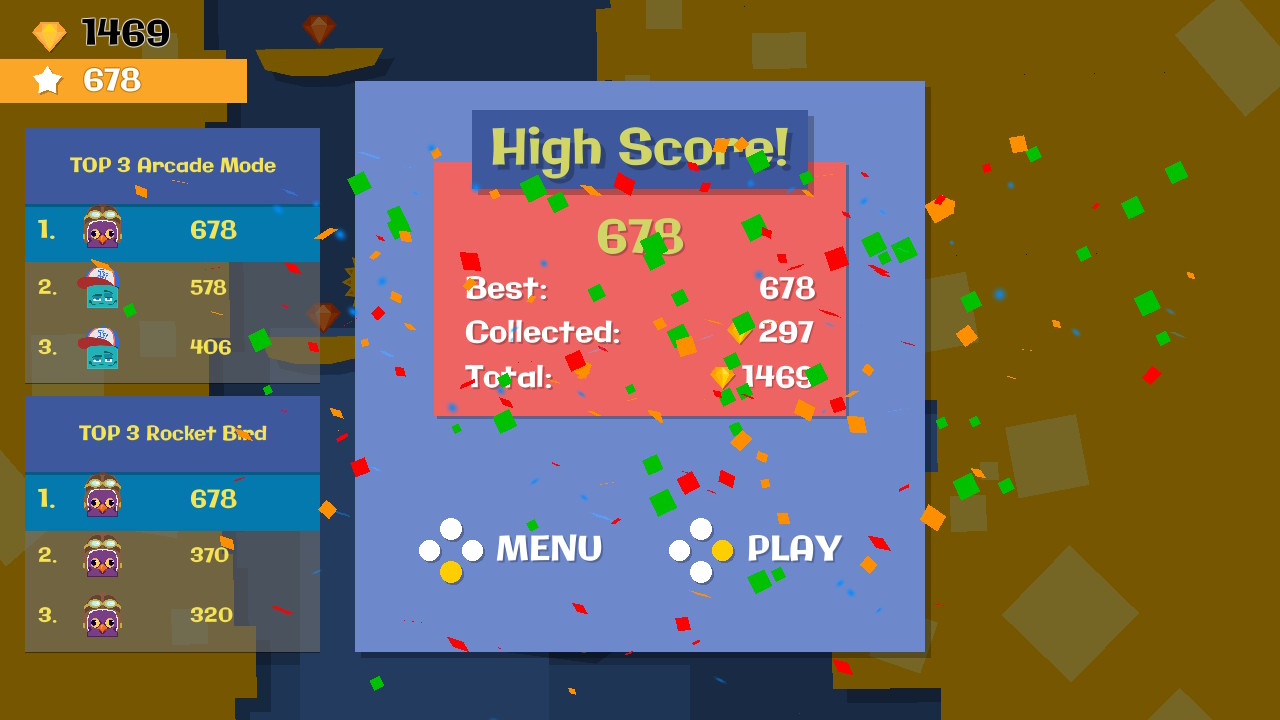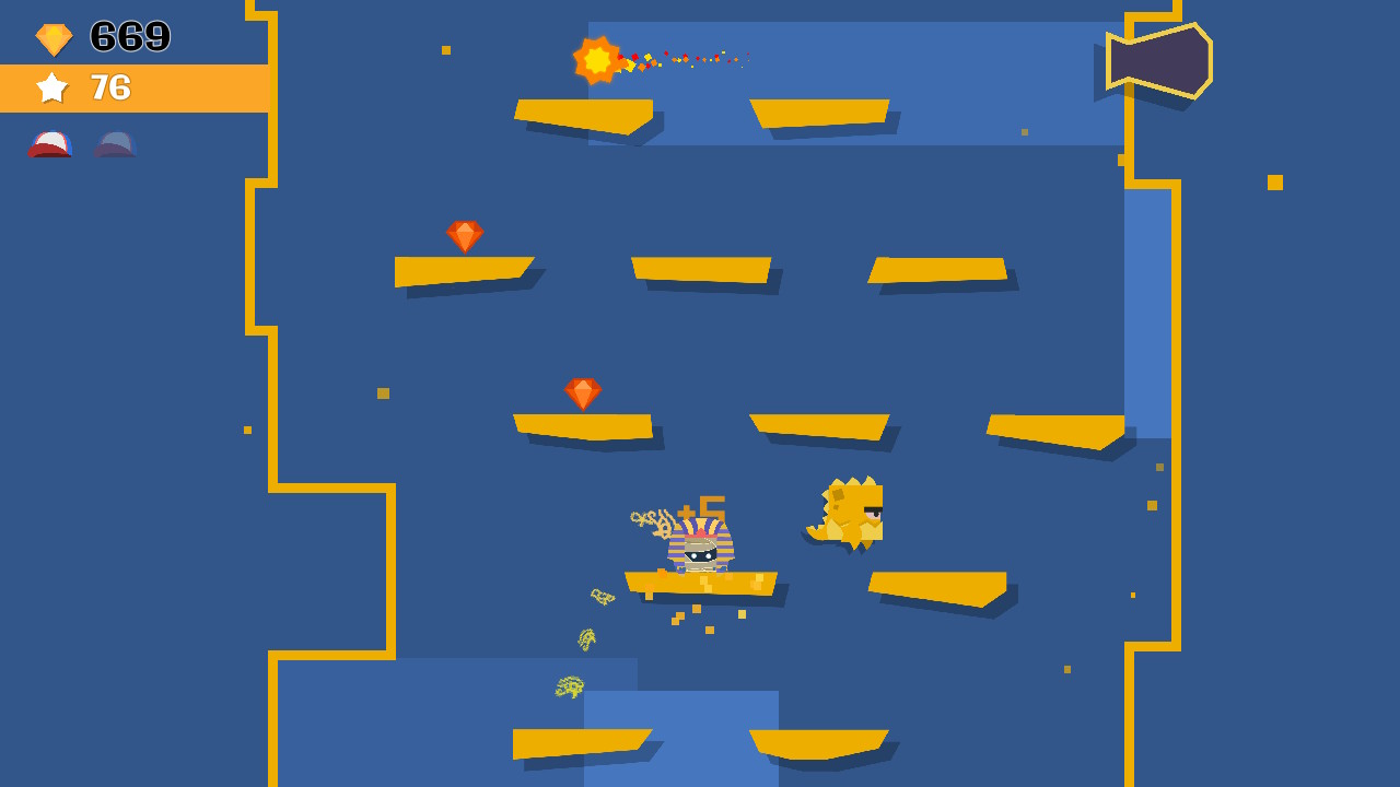 Je parle de Joe, mais qu’en est-il de ses amis ? Dans l’écran de sélection du mode de jeu, vous allez pouvoir choisir votre personnage. Dans un premier temps, seul Joe sera disponible. Mais par la suite, vous pourrez en débloquer d’autres, et chacun aura sa spécialité. Rocket Bird dispose d’un boost au début du mode arcade qui le fait commencer 50 plateformes plus haut, Rage Bomber accumule une certaine énergie puis fait exploser tous les obstacles autour de lui, Mummy ralentit le temps… Impossible de savoir combien ils sont, à chaque fois que j’ai débloqué un personnage, un autre apparaissait avec un montant plus important.