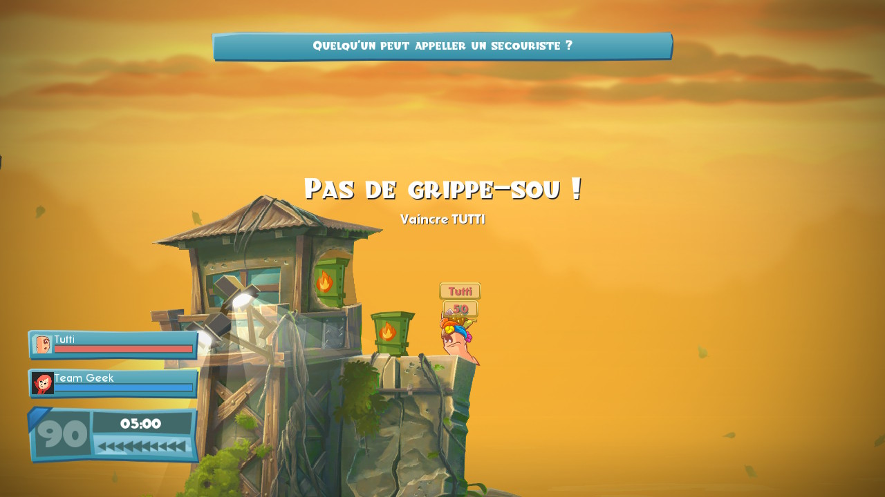 C’est un aspect que je ne maîtrise pas beaucoup, car il demande une bonne connaissance du jeu, mais qui est très intéressant. Au début d’une partie, toutes les armes ne sont pas disponibles. Certaines arrivent un peu plus tard, d’autres doivent être fabriquées, avec certains ingrédients : sauce spéciale de Boggy, pâte collante d’âne et autres. Ces derniers peuvent se retrouver dans des caisses éparpillées sur le terrain, ou être obtenus en démantelant une arme déjà possédée. Et il est possible d’effectuer ce montage pendant le temps de jeu de l’équipe adverse. Gain de temps, pas de tour perdu, mais il faut tout de même arriver à suivre ce qu’il se passe derrière son écran de fabrication pour ne pas se rendre compte trop tard qu’il ne nous reste plus qu’un seul ver en lice.