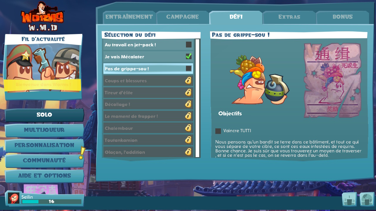 Toute la partie solo est surtout là pour vous améliorer. Son caractère ludique est assez faible, mais à force de persévérance, elle vous permet de maîtriser armes, déplacements et fabrication. Mais ne nous voilons pas la face, Worms ça se joue à plusieurs, et c’est beaucoup plus intéressant quand il y a vraiment quelqu’un derrière le ver, et pas seulement une IA pas très futée.