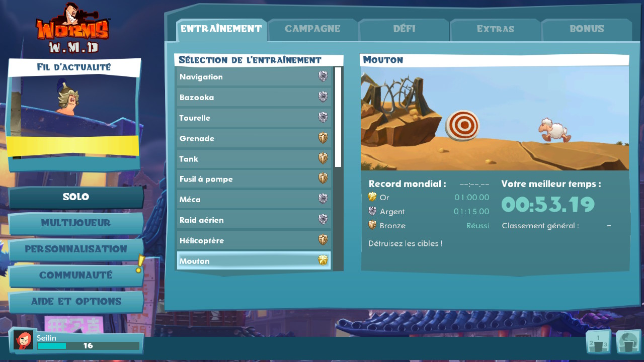 Si vous êtes complètement seul et sans réseau, vous avez accès à plusieurs séries d’entraînements. Cela va vous permettre d’apprendre à utiliser certaines armes, parmi les plus connues et utilisées comme le bazooka ou la grenade, des armes très spécifiques comme le mouton ou le jet-pack (même si ce n’est pas à proprement parler une arme), ou encore des nouveautés, notamment avec les tourelles, le tank ou le méca. Pour cela, une mission vous sera confiée, et demandera de maîtriser l’arme en question, le plus rapidement possible.