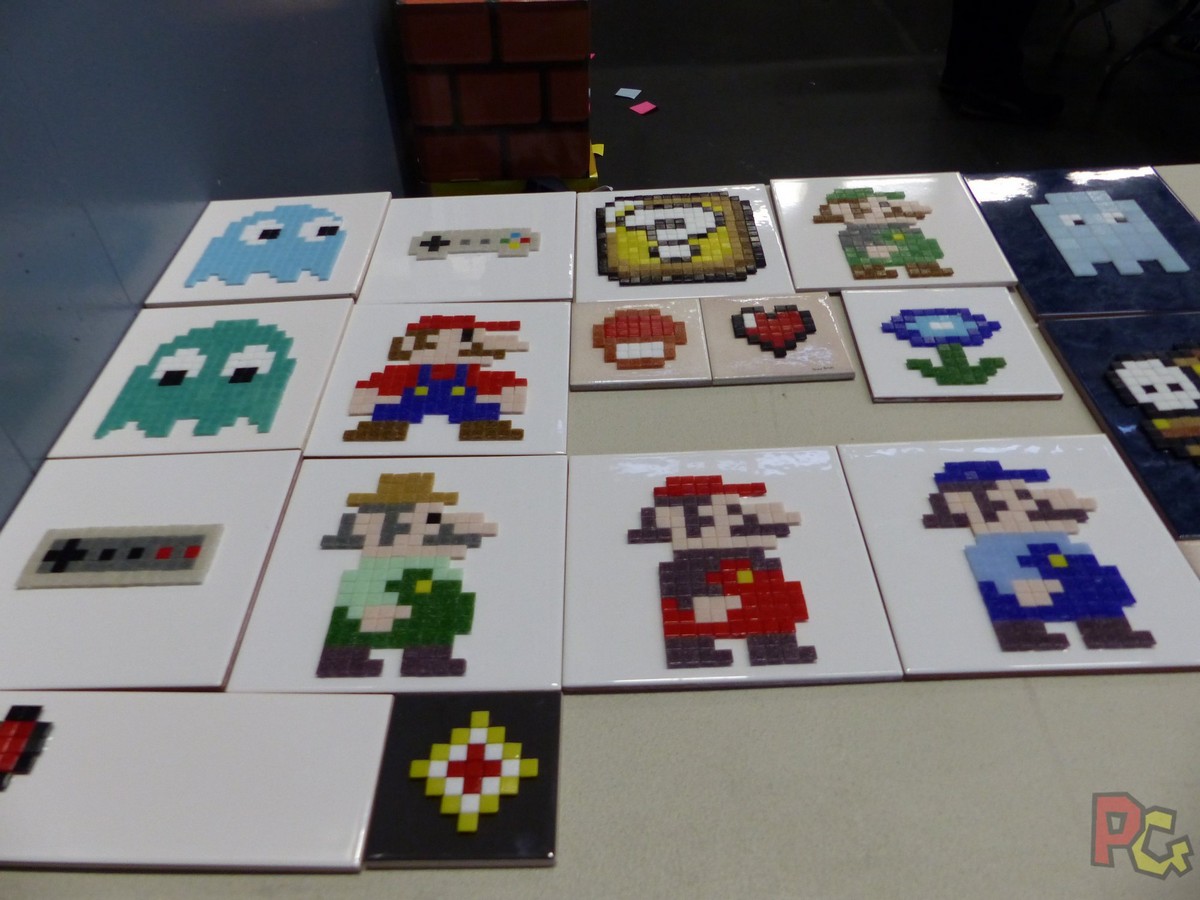 Je n’ai pas eu le temps de faire un tour détaillé de tous les stands, mais cette année j’ai tout de même pu approcher plus de consoles que d’habitude, grâce à une faible affluence le dimanche matin. Pendant que monsieur dégommait du canard sur Duck Hunt (il faut vraiment que je me trouve un télé cathodique, j’ai tout le reste à la maison…), j’ai commencé à regarder les stands d’associations et les boutiques. On y retrouvait les classiques « Entre huit et trente deux« , association qui présente de nombreuses consoles d’époque et permet de jouer à de nombreux jeux, FFVIMan pour le switchage gratuit de Super Nintendo, mais aussi plusieurs boutiques de jeux, consoles et accessoires. Pour une fois, je suis restée raisonnable et je n’ai rien acheté. Un stand qui a attiré mon attention au fond du gymnase, c’est celui des céramiques. Une sorte de pixel art, mais avec des carrés de mosaïque à la place des perles à repasser. Original et bien fait.