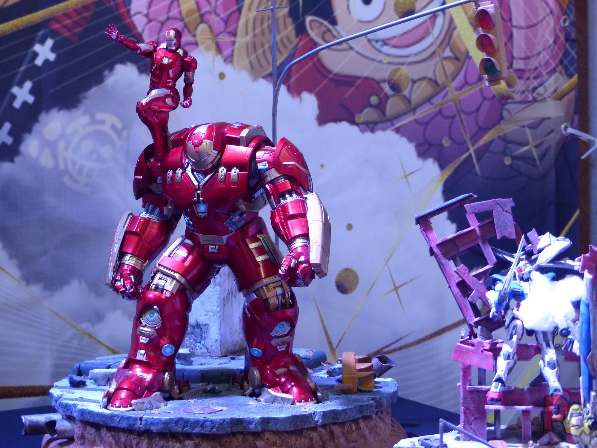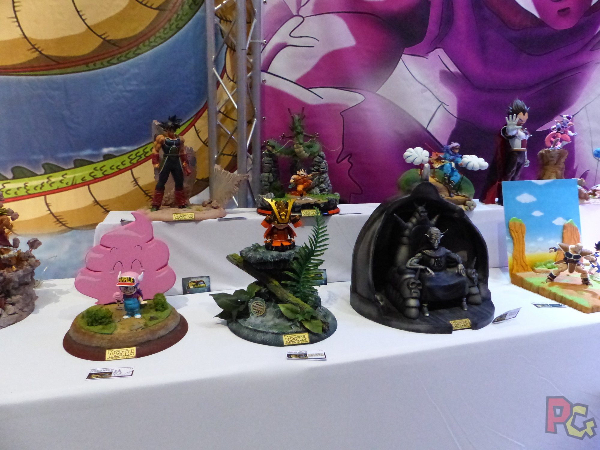 Pas très loin, ce sont les habituelles voitures légendaires qui trônaient, avec la DeLorean et K2000, mais aussi d’autres expositions inédites. La première avec de très belles pièces de l’univers Marvel, notamment le bouclier du Captain America, le gant de Thanos, ou un bébé Groot. La seconde, beaucoup plus grande, rassemblait plusieurs collectionneurs venus exposer leurs plus belles figurines issues de différents univers. Le manga avec Saint Seiya, Dragon Ball ou Collège Kimengumi, les jeux avec Assassin’s Creed, les films et séries avec Marvel, DC et encore plein d’autres… Là aussi, de superbes œuvres, dans un espace un peu confiné qui apportait une touche de confidentialité à l’exposition. J’ai beaucoup aimé.