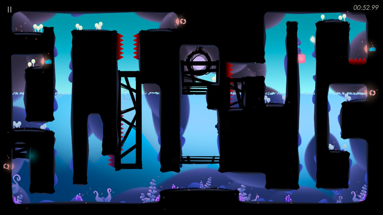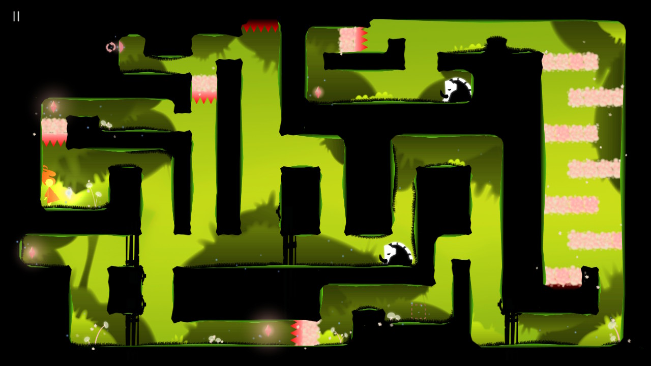 Côté graphismes, j’ai été totalement conquise. C’est à la fois assez minimaliste et parfaitement détaillé. L’arrière plan dispose d’une palette de couleur propre au chapitre (rose et bleu pâles pour le réveil, vert pour la forêt, bleu pour l’eau…) avec divers éléments distincts, tandis que le premier plan est entièrement noir, permettant de bien visualiser les éléments solides utiles à la progression de Kora. Très peu de textures au premier plan, mais certains éléments sont très bien travaillés, comme les plateformes rotatives. Un vrai souci du détail, rien n’a été laissé au hasard. Sans oublier les quelques mécanismes essentiels tels que interrupteurs, pics, et bien sûr les cristaux, tous en couleur vive. Le rose correspond à tout ce qui est allié, mécanismes et cristaux, tandis que le rouge est à éviter.