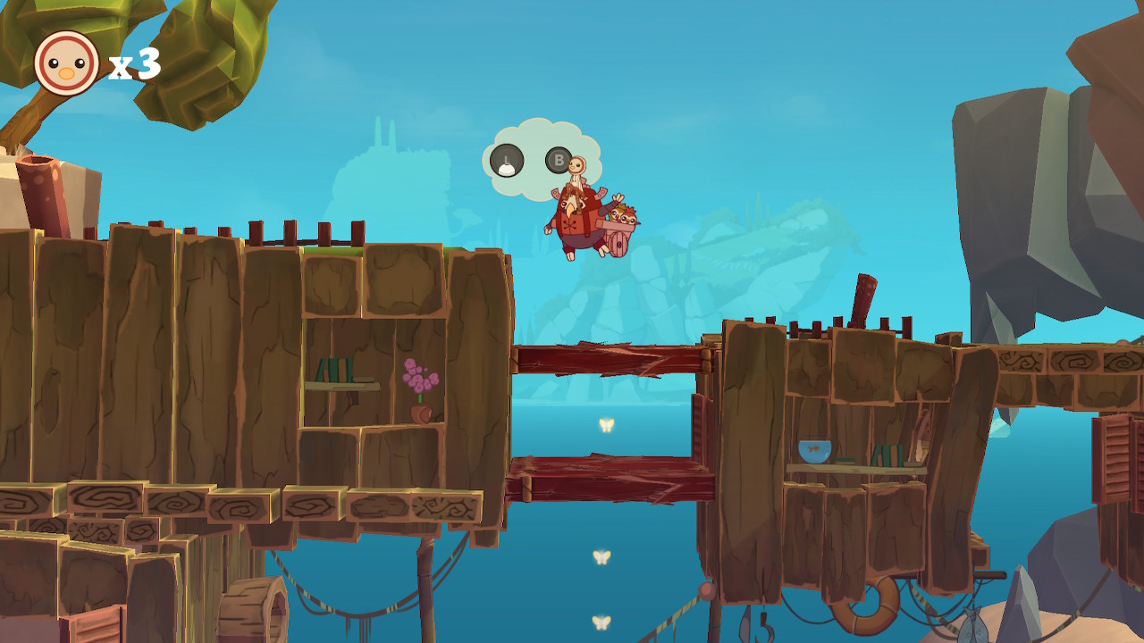 Les personnages ont un design étrange. Des sortes d’humanoïdes à bec à faible personnalité, principalement à cause de l’absence de paroles. Mais Shu plus particulièrement est très attachant. Sa petite bouille à côté du nombre de vie fait penser à un petit poussin, et quand il parcourt les niveaux, il est très fluide, et plane parfaitement.