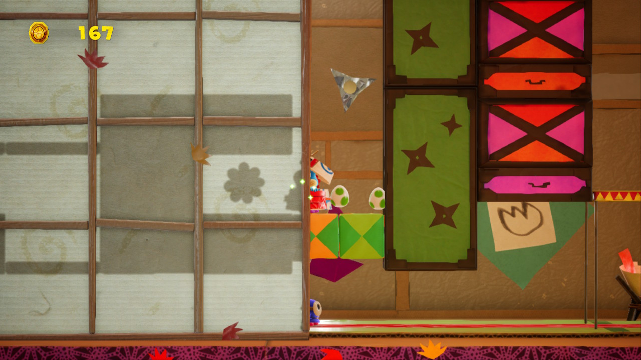Dans ce nouveau monde, les décors semblent très plats, et des rouleaux à dérouler symbolisent les chemins. Vous pouvez vous en douter, Yoshi devra parcourir plusieurs mondes et affronter des boss pour récupérer les gemmes perdues, et Kamek et Bowser Junior se mettront en travers de son chemin.