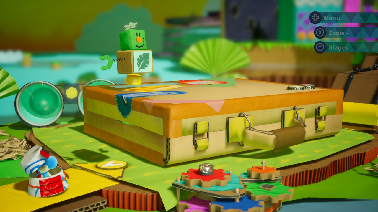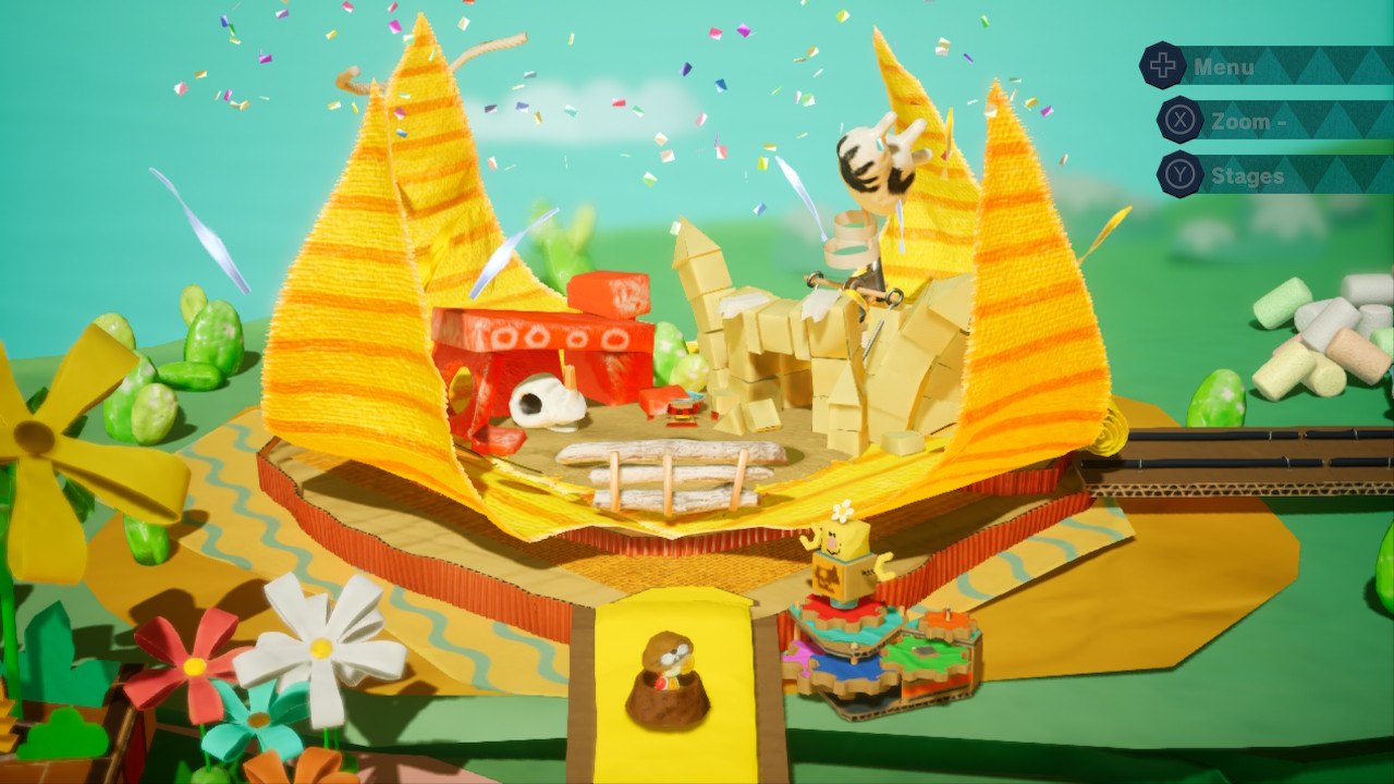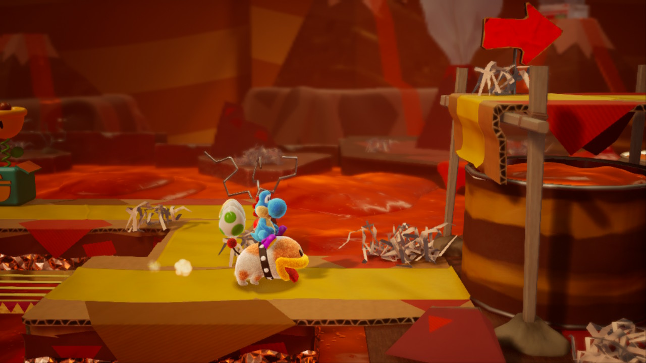 Les niveaux sont tous construits sur la même base, si on met de côté le thème du monde. Ils sont faits de morceaux de recyclage, principalement du carton, mais aussi des boîtes de conserve, emballage, etc… Mais l’ensemble est bien repeint et décoré, pour un final harmonieux et très plaisant, et finalement très différent d’un monde à l’autre. Comme je le disais, le chemin est représenté par une bande de couleur jaune, mais il faut également tenir compte de l’arrière et du premier plans. Tous deux contiennent des ennemis, des pièces, ou des éléments sur lesquels envoyer des œufs est plus que conseillé. Ces œufs, ils s’obtiennent en avalant des ennemis, ou grâce à des boîtes qui en distribuent à l’infini.