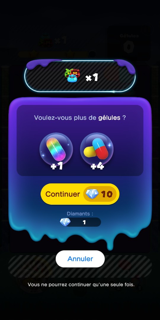 - Acheter des gélules supplémentaires pour terminer un niveau si vous n’êtes pas arrivé au bout