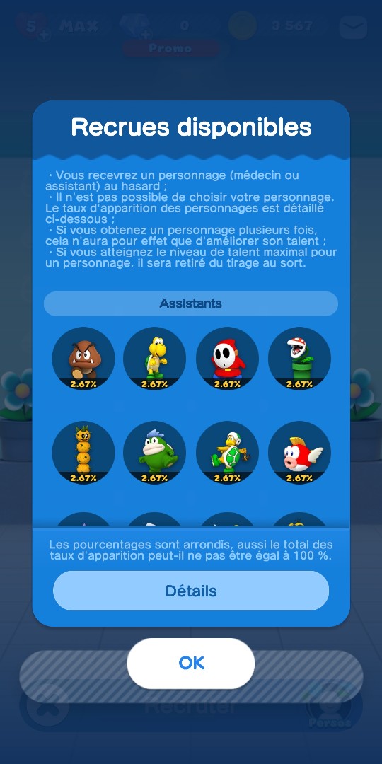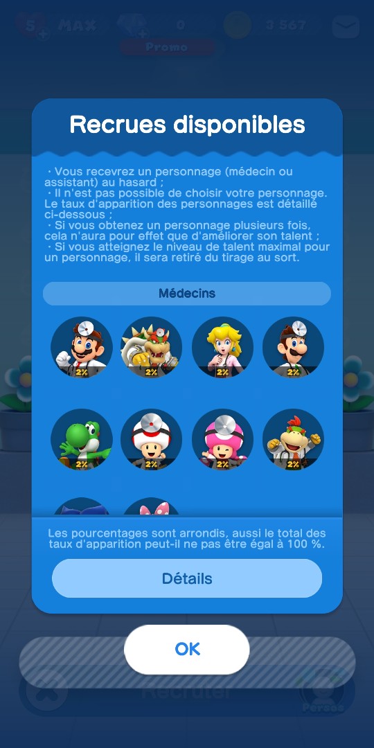 Médecins et assistants sont tous disponibles par le même système de loterie. Vous pouvez recruter un nouveau personnage grâce à un ticket de recrutement, 4000 pièces, ou 40 diamants.