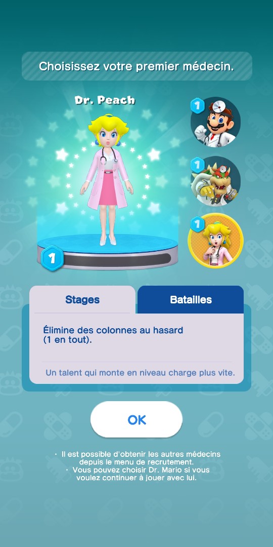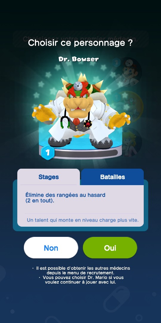 C’est à partir du niveau 10 qu’il vous sera possible de choisir votre médecin fétiche. Vous pouvez conserver Mario qui était le docteur par défaut, ou l’échanger contre Peach ou Bowser. Les autres seront disponibles à partir du niveau 20. Chacun dispose d’un talent spécifique, représenté par une barre qui se remplit au fil de la partie. L’un peut détruire des colonnes, l’autres des rangées, et d’autres encore échanger des virus contre des boîtes à objets…