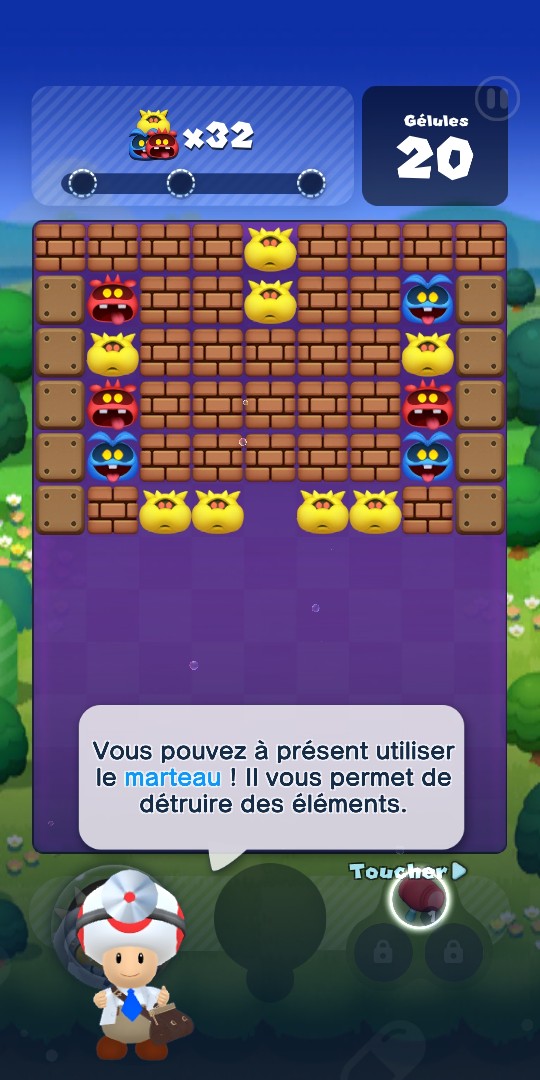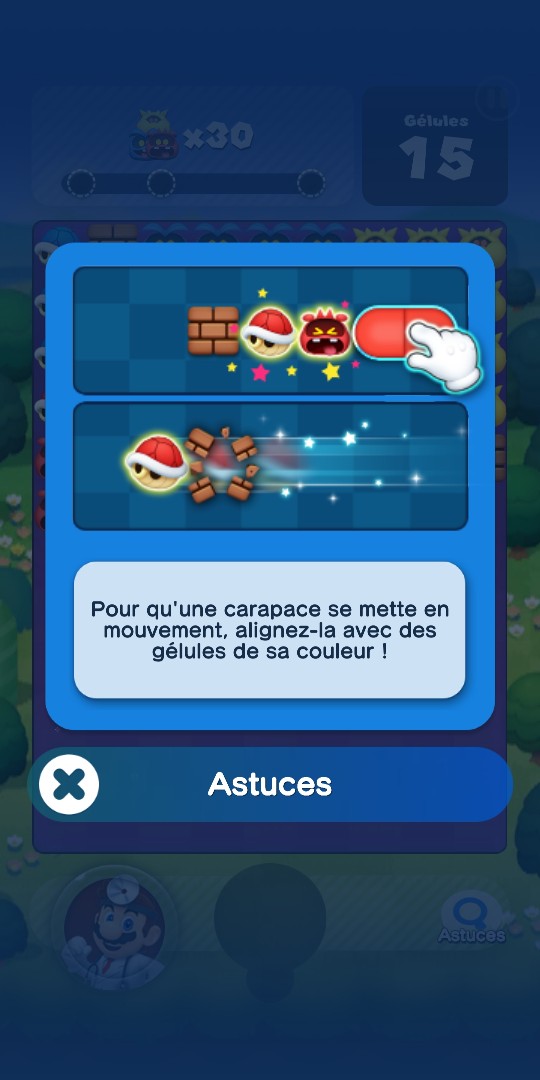 Puis, petit à petit, sont intégrées toutes les autres possibilités du jeu, à commencer par l’utilisation d’objets pour gagner un niveau plus facilement, comme un marteau ou des gélules supplémentaires. Puis des ajouts au sein même du niveau, des aides et des difficultés. Chaque nouvel ajout donne lieu à une mini-fiche tuto pour vous expliquer son fonctionnement. Gélules arc-en-ciel bonus, carapaces qui vont détruire toute la rangée, blocs de glaces immobilisant les virus, nouveaux objectifs comme des pièces à trouver… Les niveaux peuvent être très variés et se complexifient au fil des mondes.