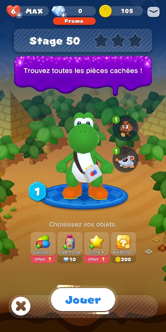 - Vous essayez de gagner les 3 étoiles pour chaque niveau ? Privilégiez les assistants qui boostent le score. Goomba vous donne 1% du total, Bob-omb 400 points systématiquement, d’autres octroient 50 points par virus d’une couleur spécifique… La connaissance du niveau et des couleurs des virus présents permet de gagner des points plus facilement.