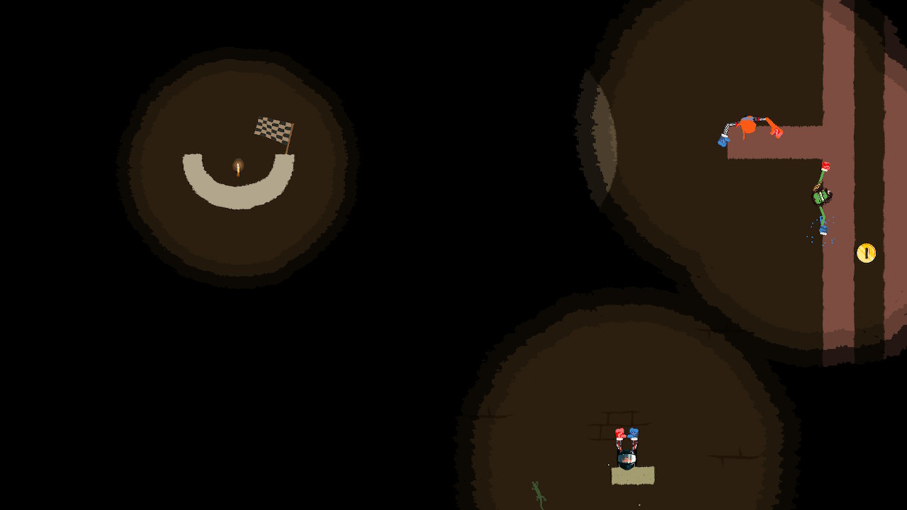 A l’écran, pas de sol, juste quelques plateformes, suffisamment espacées pour qu’on commence à réfléchir dès le début au trajet qu’il faudra faire. Et un drapeau, généralement à l’autre bout de l’écran, dans une sorte de demi cercle. Le but est très simple : tous les joueurs doivent atteindre l’arrivée du niveau. Seuls ou ensemble peu importe, mais tous doivent y arriver ! Élongation de bras, sauts hasardeux, chaines humaines (si tant est qu’on peut appeler nos personnages des humains…), toutes les solutions seront bonnes à prendre, et à tenter.