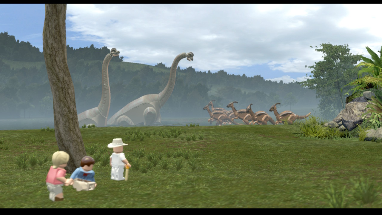 Tout commence avec l’arrivée d’une cage à Raptor sur Isla Nublar, l’île de Jurassic Park. Cela permet de mettre en scène notre premier personnage et de prendre les commandes du jeu. Forcément, il y a des Lego de partout, que ce soit les éléments du décor, les objets, les personnages, et même les animaux. Bien entendu, même les dinosaures sont en Lego, mais nous ne les voyons pas tout de suite. Leur première apparition est grandiose (épisode Jurassic Park pour ma part, avec la scène de la vision des brachiosaures par Allan Grant et les autres depuis la Jeep). En parallèle, une grande partie du décor est beaucoup plus réaliste, comme l’eau, le ciel, et tous les éléments du décor qui ne sont pas atteignables (certains arbres, les montagnes en arrière-plan, etc…).