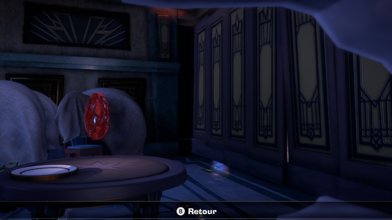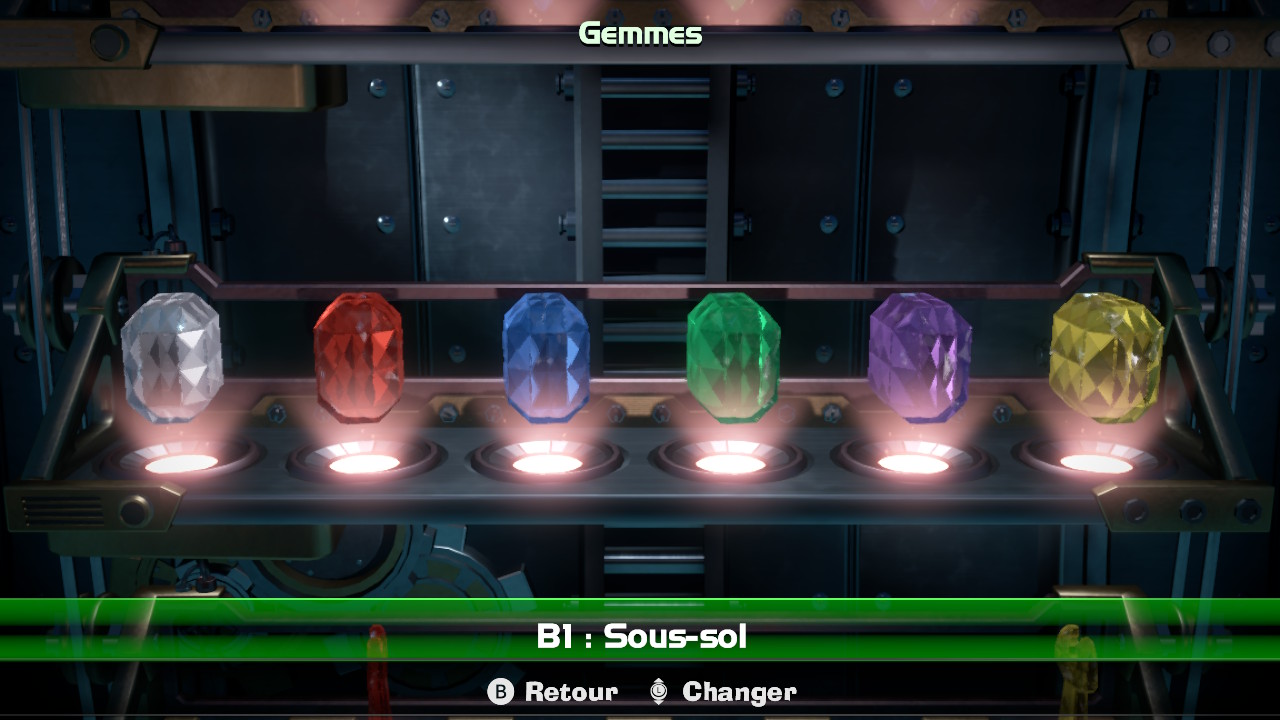 D’une forme en lien avec ces thèmes, 6 gemmes de couleur sont réparties dans chaque étage. Il vous faudra les trouver (si vous le souhaitez), en usant d’observation et de logique. Certaines sont particulièrement bien cachées, et d’autres ne peuvent être obtenue qu’après une suite d’actions spécifiques. Ce n’est donc qu’en aspirant tout sur votre passage, en flashant à tout va, et en essayant de casser un maximum d’objets que vous pourrez espérer y arriver ! Les pires à obtenir ? Celles que l’on voit, mais on ne sait pas comment y accéder ! C’est mon cas pour quelques-unes encore, et les détecteurs de gemmes à acheter auprès du professeur ne va pas m’aider sur ce point…