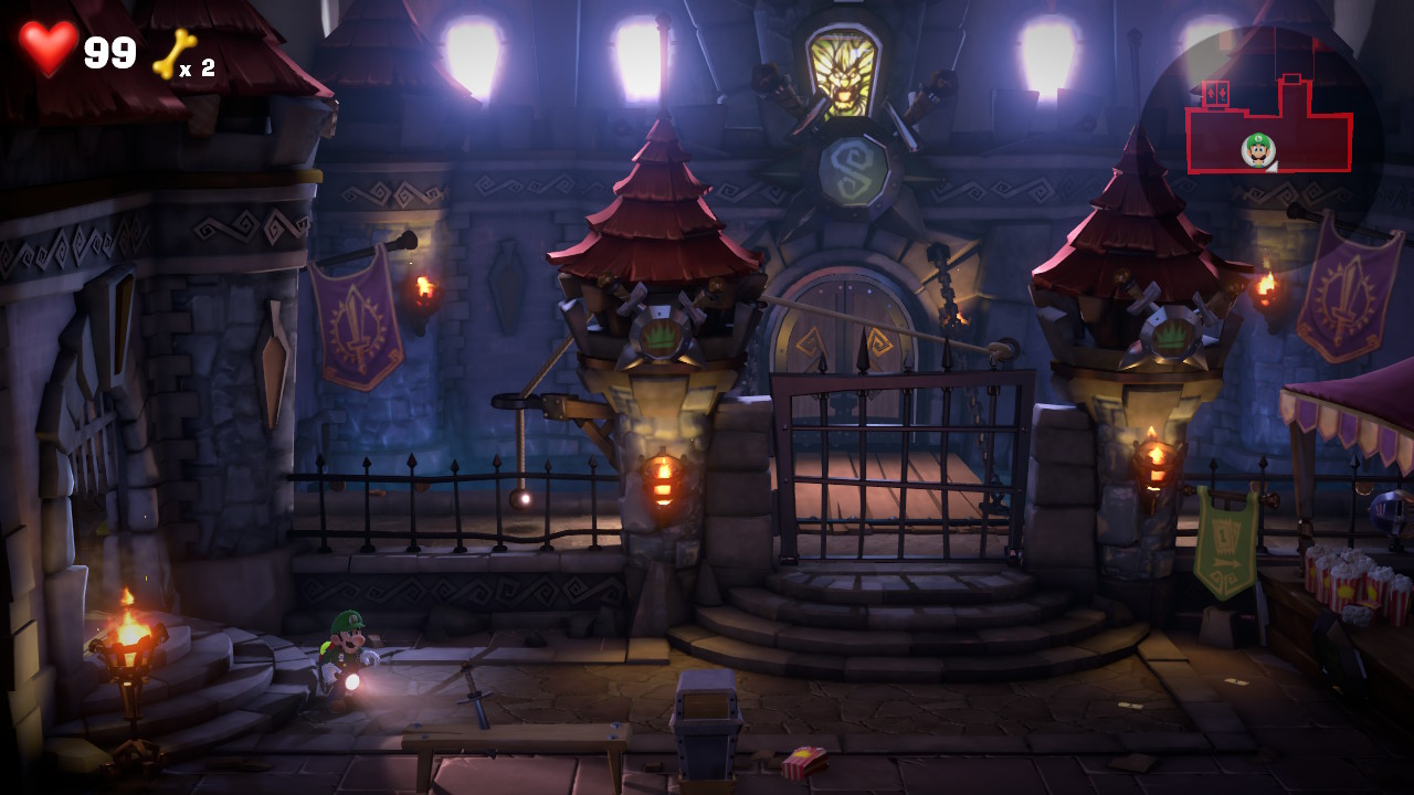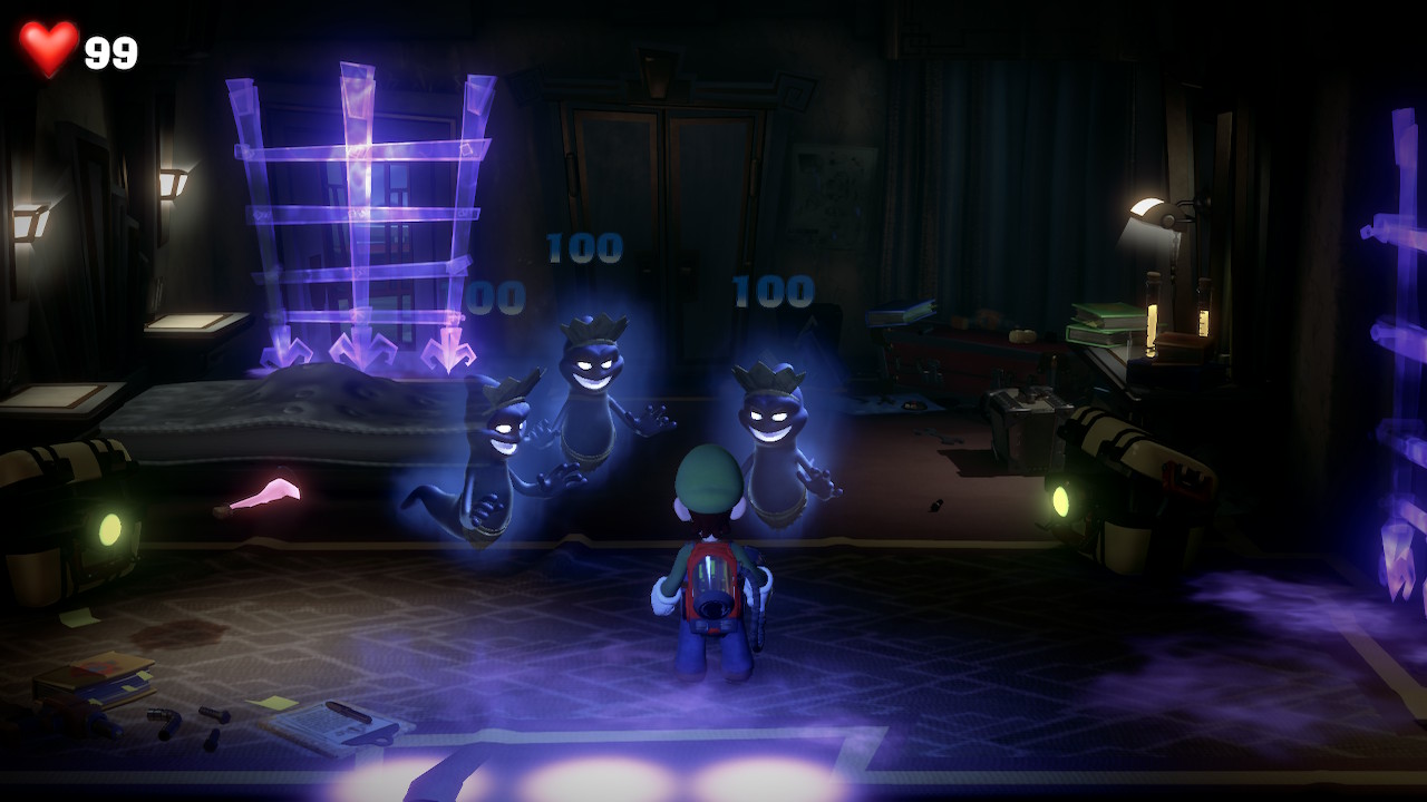 Dans le hall d’entrée, Luigi rencontre les premiers fantômes. Comme dans les épisodes précédents, ces derniers sont à flasher pour les rendre aspirables. Il faut ensuite activer l’aspirateur, les balancer de droite à gauche pour les étourdir avant de les aspirer complètement. Très pratique, l’Ectoblast GL-U ne se remplit pas vraiment, et ne dispose pas de capacité limitée