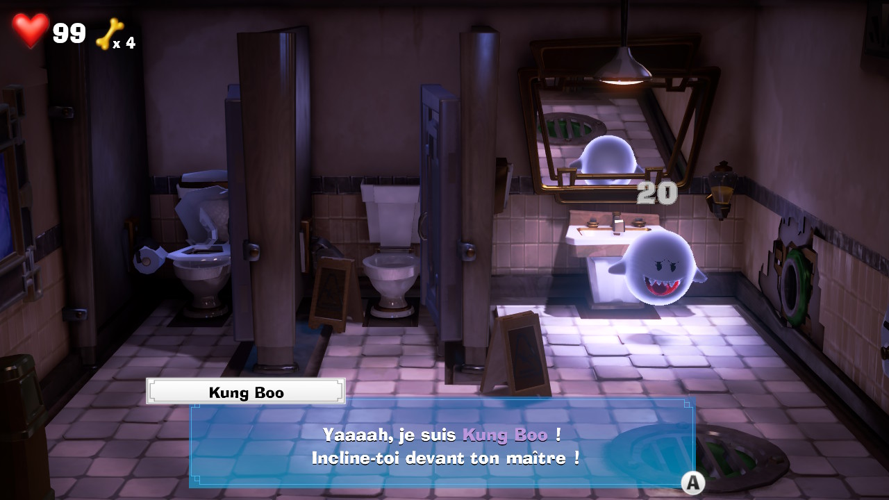 Mais pour terminer le jeu à 100%, il n’y a pas que les gemmes. Il y a également des petits Boos à trouver. Il y en a un par étage, mais il n’est possible de les trouver qu’après une certaine progression dans le jeu. Et c’est là où les joueurs Switch Lite seront lésés, car ces Boos ne se trouvent que grâce aux vibrations de la console… Sinon, il faut fouiller de partout, mais si on rate le coche, le Boo fuit ailleurs dans l’étage, et il faut recommencer.